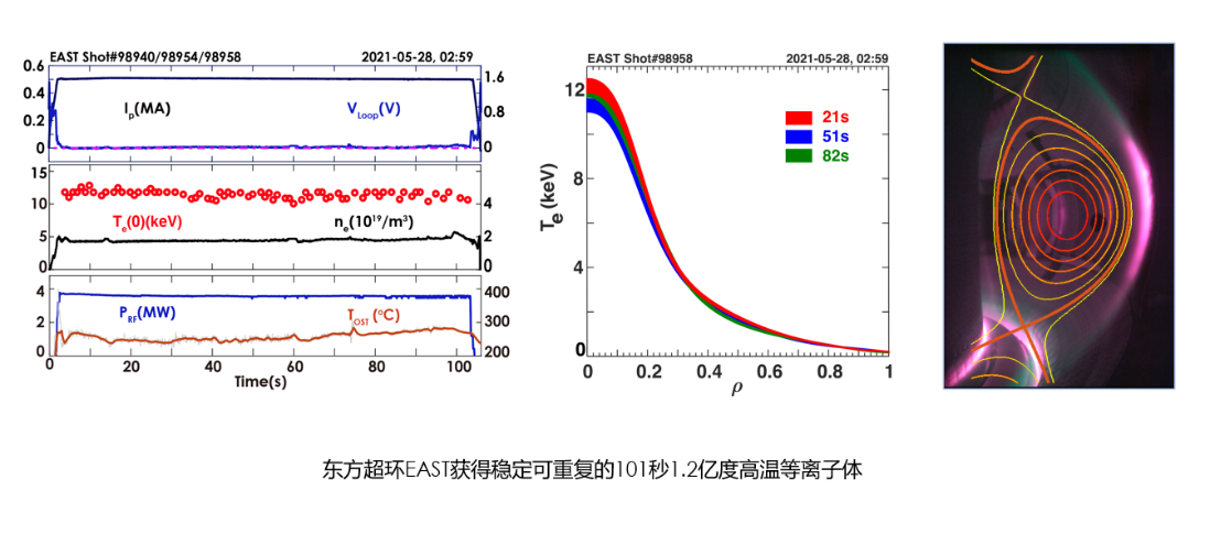 去年6月EAST装置启动升级改造,历时一年性能得到了全面提升,并在物理实验中攻克了稳态高功率加热、完全非感应的高电流驱动、高精度等离子体实时控制、高热负荷等离子体与壁材料相互作用等系列技术难题。近日,实现1.2亿度101秒等离子体运行,将去年EAST装置物理实验实现的1亿度20秒的世界纪录提高了5倍,表明EAST装置综合研究能力获得重大突破,标志着我国在稳态高参数磁约束聚变研究领域引领国际前沿。