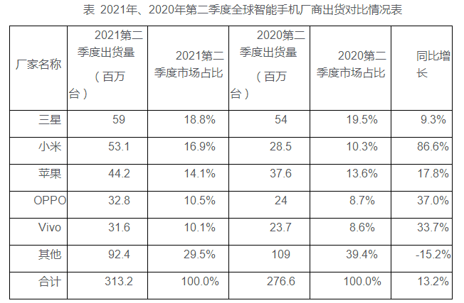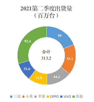 图 2021年第二季度全球智能手机出货情况