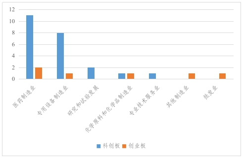 2021年上半年,国内A股市场共成功上市245家公司。其中医疗保健设备与服务、制药、生物科技与生命科学等生物医疗领域公司29家,占全部上市公司的11.84%。从上市板块来看,科创板共上市23家企业,创业板共上市6家企业。根据证监会行业分类,在科创板上市的23家企业中,医药制造业11家,专用设备制造业8家,研究和试验发展2家,化学原料和化学品制造业1家,专业技术服务业1家。在创业板上市的6家企业中,医药制药业2家,专用设备制造业1家,化学原料和化学品制造业1家。