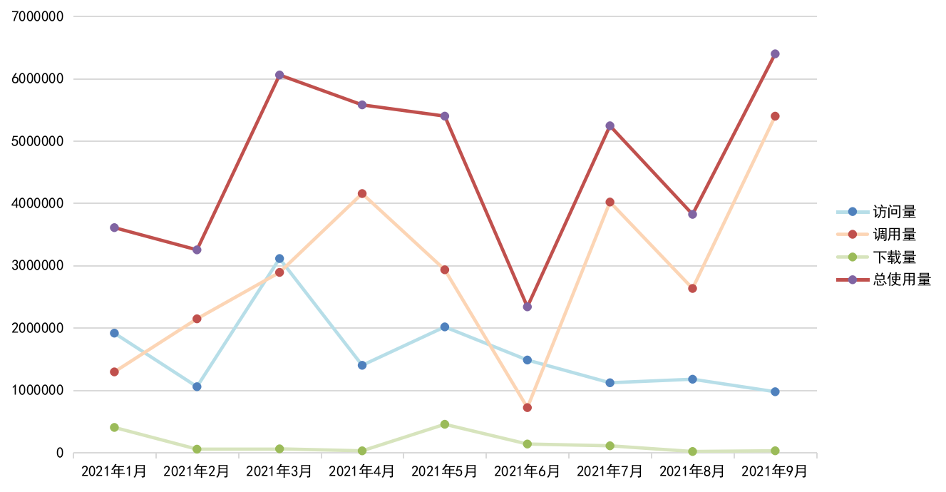 2021年9月,山东省公共数据开放网站数据使用量为:6,398,054次,较上月提升67.4%。其中,访问量974,107次,调用量5,397,642,下载量26,304次。