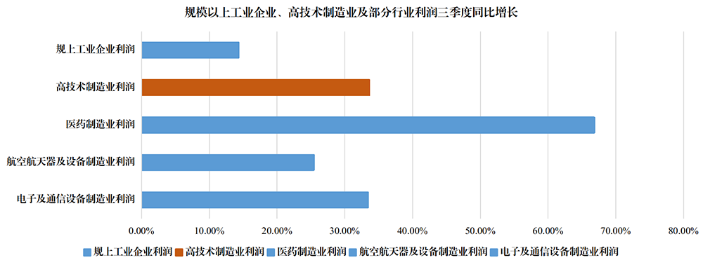 根据国家统计局数据,2021年三季度,全国高技术制造业利润同比增长33.6%,增速高于规模以上工业平均水平19.3个百分点,引领作用显著。其中,医药制造业受国内外疫苗需求量较大、企业产销两旺等因素拉动,三季度利润同比增长66.8%,延续年初以来的高速增长态势;电子及通信设备制造业受企业收入平稳增长、投资收益由降转增等因素拉动,利润同比增长33.4%,增速比二季度加快14.6个百分点;航空航天器及设备制造业利润同比增长25.4%,保持较快增长。