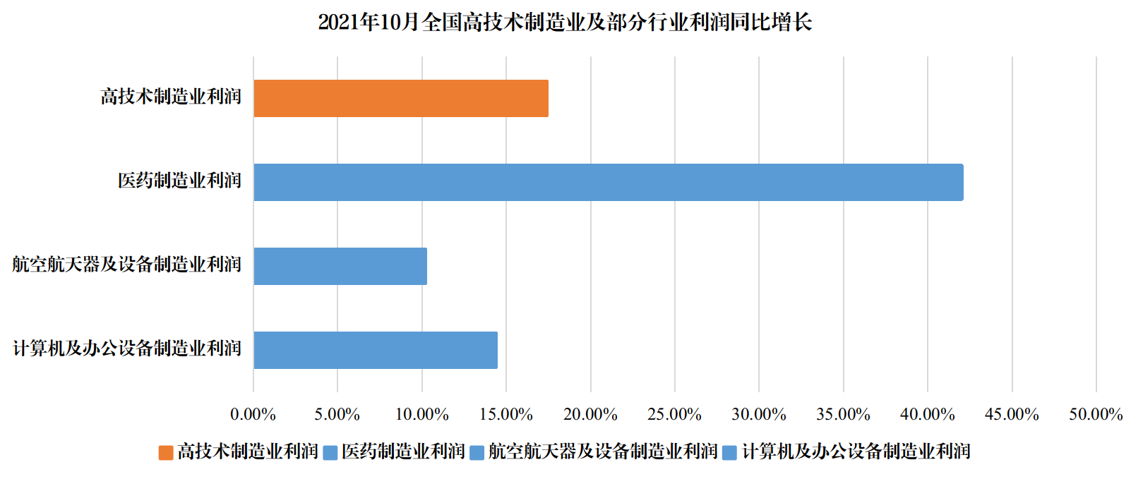 根据国家统计局数据,2021年10月,全国高技术制造业利润同比增长17.4%,延续两位数增长态势,对规模以上工业企业利润增长的贡献率为11.0%,继续为推动工业经济结构优化、实现转型升级助力。分行业看,疫苗、计算机等产品市场需求较好,在企业订单增加等因素带动下,医药制造业利润同比增长42.0%,增速较上月加快12.6个百分点;计算机及办公设备制造、航空航天器及设备制造行业利润同比分别增长14.4%、10.2%,均实现较快增长。