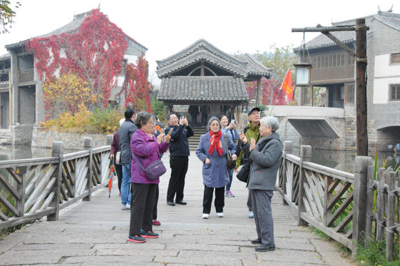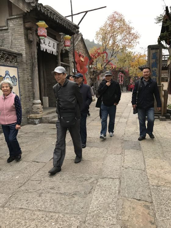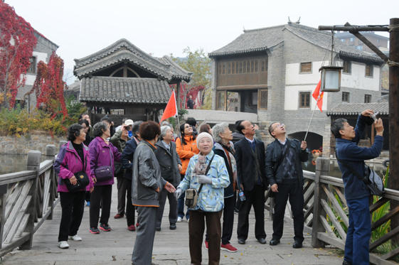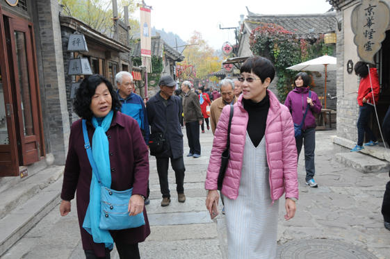 古北水镇背靠中国最美、最险的司马台长城,坐拥鸳鸯湖水库,是京郊罕见的山水城结合的旅游度假区。深秋的古北水镇秋意正浓,层林尽染、色彩斑斓。三色彩叶妆点着小镇,红色的爬山虎攀爬在鳞次栉比的房屋上,似红帘;黄色的银杏叶飘落在幽静的水面,像浮萍;绿色的垂柳被秋风轻抚,如丝绦。青石板的街道,悠长的胡同,远处险峻的司马台长城,使这座北京建成的的“江南小镇”兼具雄伟、雅致,别具风格。老同志们三五成群,结伴漫游,参观了司马小烧、永顺染坊、震远镖局等景点,欣赏了老戏台上别具韵味的京东大鼓和河北梆子,醉心于青瓦红叶、小桥流水、幽静小径,还到伞庄、风筝店、鞋荘等特色小店一探究竟,充分领略了古朴、精美的仿明清及民国风情水乡小镇风貌,好不惬意。一步一景的如画小镇令老同志动容,驻足、凝望将美景尽收眼底,对焦、按动快门将秋意图实时分享朋友圈,有的老同志竟饶有兴致地在室外汤泉池体验了温泉,游意兴。