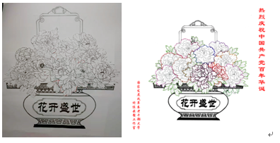 精心设计,反复修改图纸。图案设计者金耀华同志介绍,“花开盛世”的创作灵感来自天安门广场的花篮图形,牡丹是国花,它雍容华贵,正好用来表达祖国繁荣昌盛的寓意。从最初的构思到成品,金耀华同志九易其稿。她不仅对每朵牡丹花的形状、大小进行了多次调整,而且对作品标题和落款的摆放位置、字体及颜色也进行了多种尝试,最终才选定。在一次次修改完善中,设计图纸也越来越精致。
