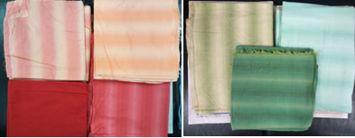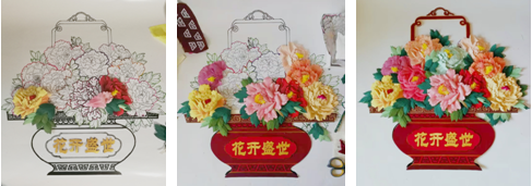 用心选材,挑选优质材料。“花开盛世”是用布贴的形式将设计的图案表现出来,布料的颜色、纹理、质感等都会影响作品最终效果,老同志们在原材料的选择上煞费苦心。因凤尾纱的颜色从浅到深,能够呈现出渐变的效果,所以牡丹花及其叶子选用的是12种不同颜色的凤尾纱。而花篮需使用纯色的布料,故选择的是大红色的人造棉,经染色加工后成为深红色。同时,为了使作品立体效果更佳,选用了硬度较高厚度较大的卡纸搭配布料一起使用。