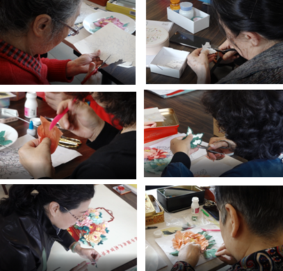 匠心制作,打造精美作品。为使“花开盛世”制作得更加精美,老同志们先每人制作了一朵完整的牡丹来进行练手,然后再依据制作情况进行分工协作。最终,13位老同志中,8位负责制作牡丹花,4位负责制作叶子,1位负责制作花篮、花朵加色及作品组装。“花开盛世”的制作采用金耀华同志独创的绮练嵌塑工艺,共有8道工序,其中最难的是让整个作品变得立体。要想把牡丹花做得斗转腾挪,象鲜花一样立体灵动,必须通过手掰的形式先后进行三次塑形。掰的时候力道既不能太大也不能太小,太大会把辛苦做好的牡丹花掰坏,太小达不到塑形效果。同时,要想使花篮和立体的牡丹融为一体,需用创意泥做底胎,使其鼓起来,整个画面才能协调自然美观。