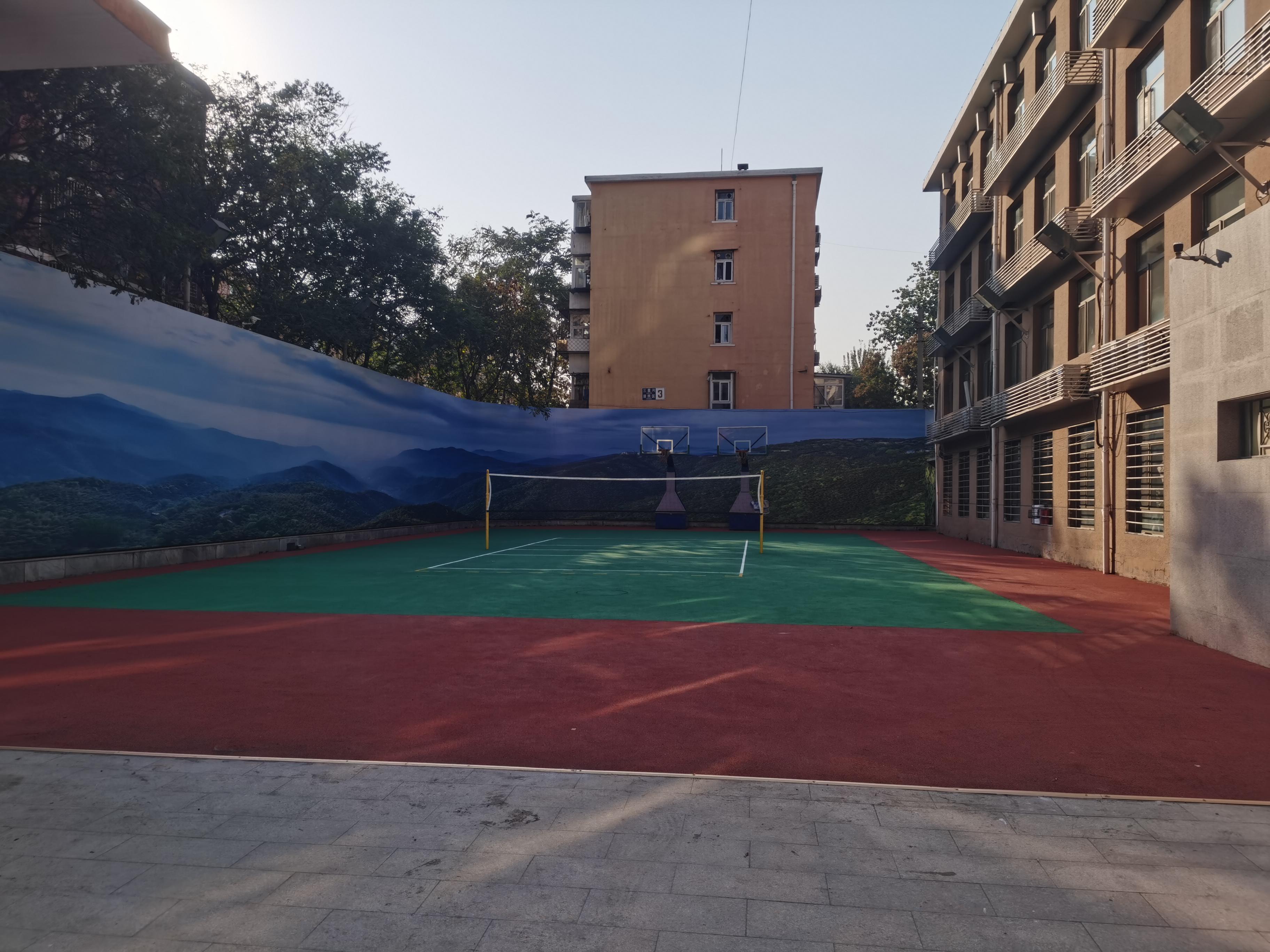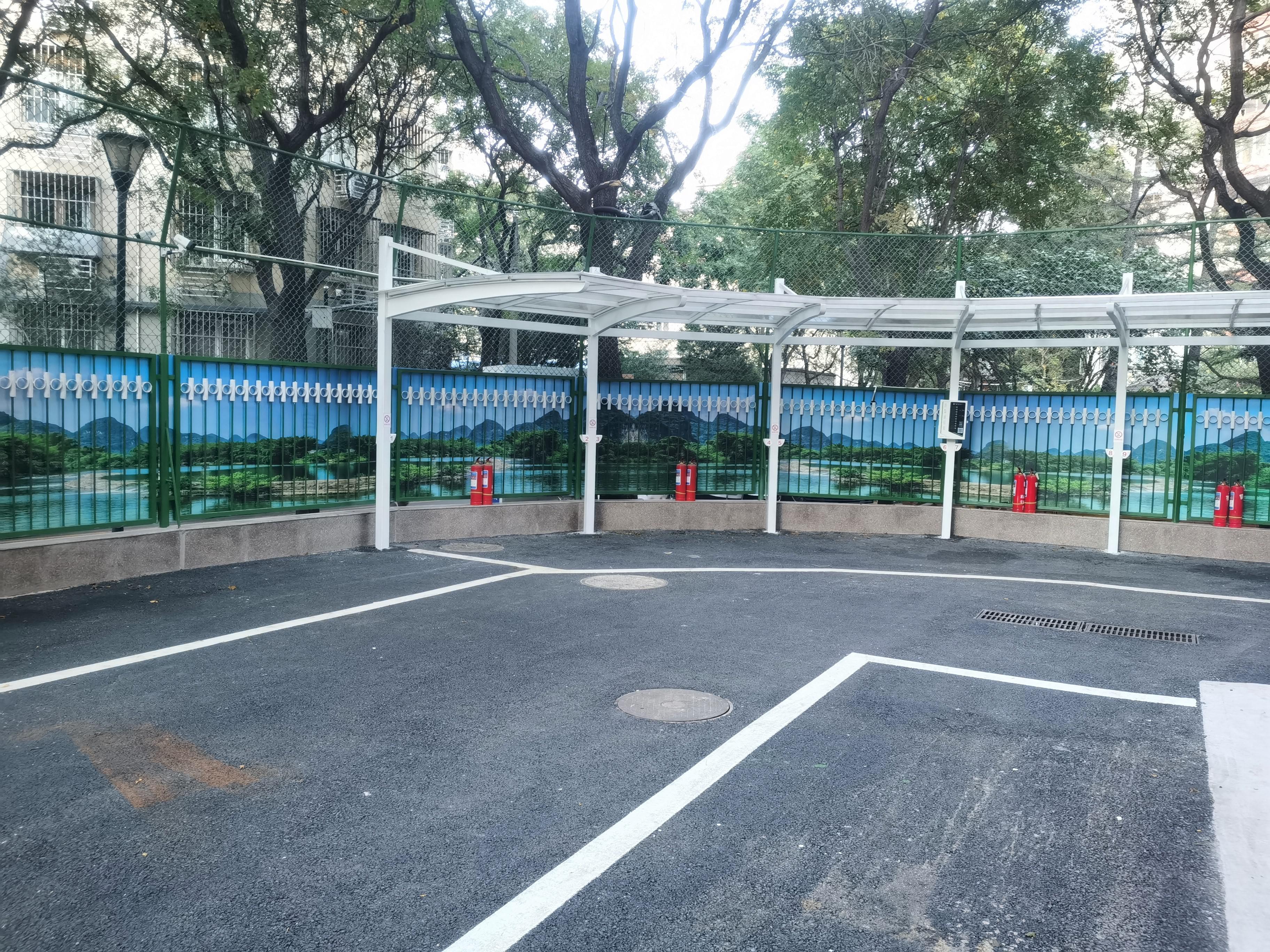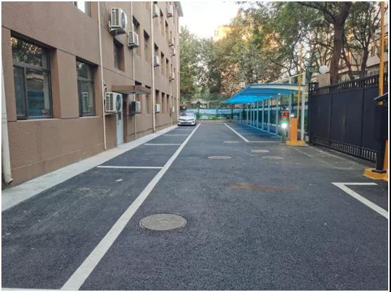 活动中心除铺设新型地胶场地外,通过创新布局方式、科学规划,将篮球、气排球、羽毛球场地功能进行整合使用,有效提升了场地利用效率;在活动中心北侧,拆除老旧的活动板房,开展土方平整、悬挂物拆除施工及围栏、道路等设施建设,整体改造为停车场设施和充电综合配套设施。