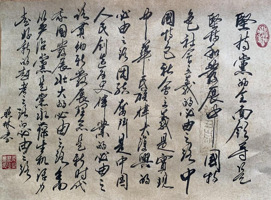 11月21日,国家发展改革委老干部大学组织举办的“学习党的二十大 笔墨丹青展情怀”主题书法云笔会第四期继续进行。90岁高龄的21支部书记谢仰安同志书写了“攻坚克难谋发展 稳中求进征新程”,32支部委员屈照林同志书写了五个必由之路、踔厉奋发、奋进新时代、“三个务必”等内容,挥毫泼墨,以书言志,表达了把思想和行动统一到党的二十大精神上来的决心。(文体处 刘博雅供稿)