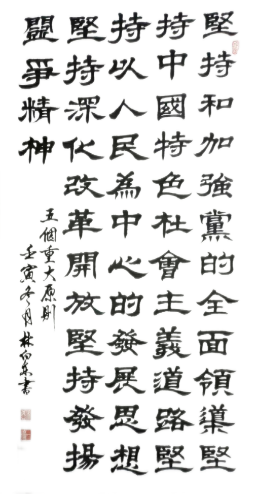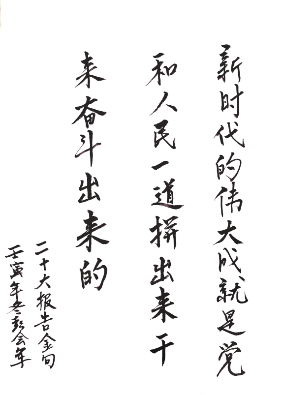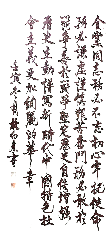 11月24日,国家发展改革委老干部大学组织举办的“学习党的二十大 笔墨丹青展情怀”主题书法云笔会第七期展览了彭会军和林向东两位老同志的作品。其中,彭会军同志书写了“谦虚谨慎 艰苦奋斗”、新时代的伟大成就、“自信自强 守正创新”等内容,林向东同志书写了不忘初心牢记使命、五个重大原则等内容,通过行云流水的作品,将学习党的二十大精神感悟倾注笔墨间。(文体处 刘博雅供稿)