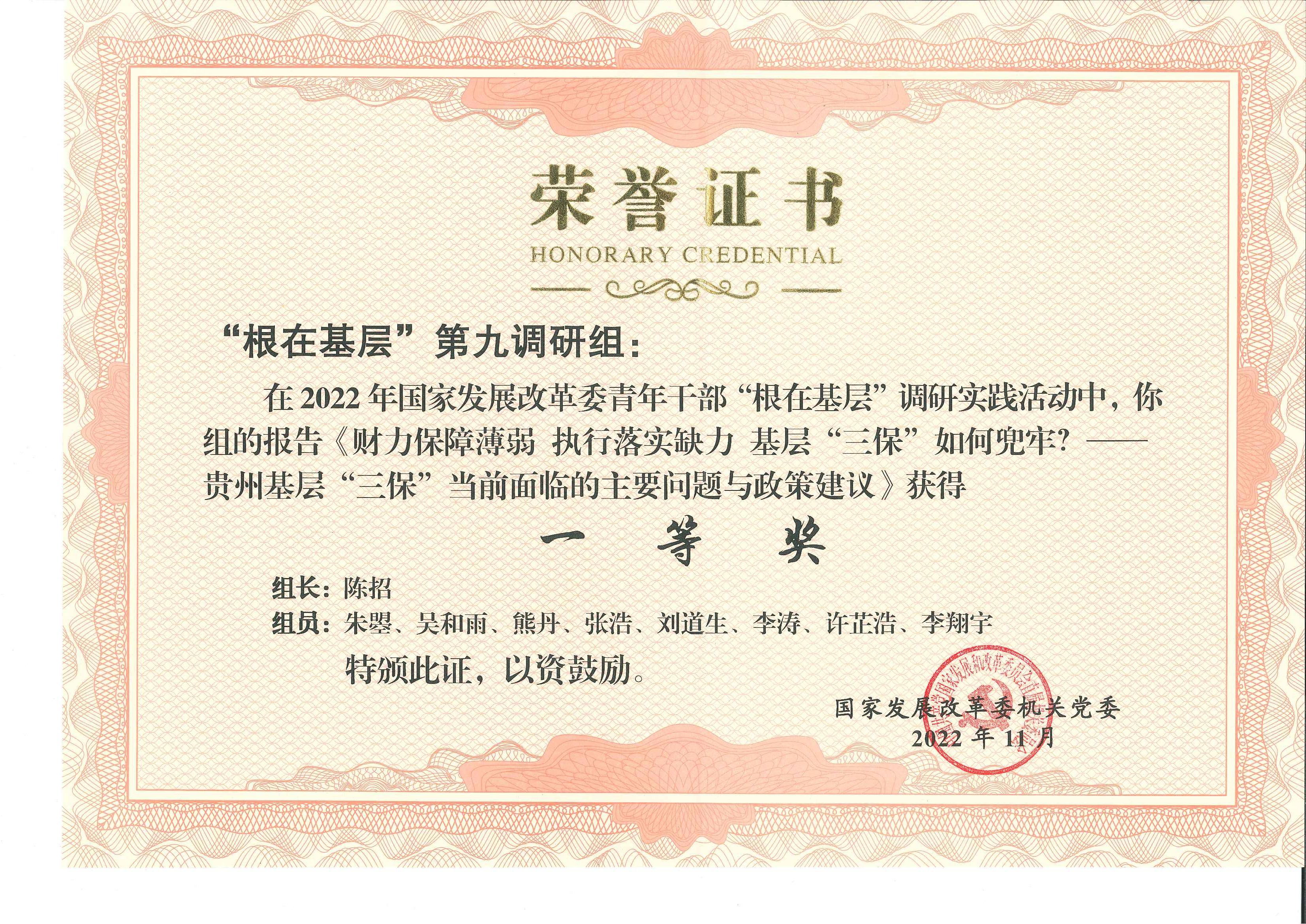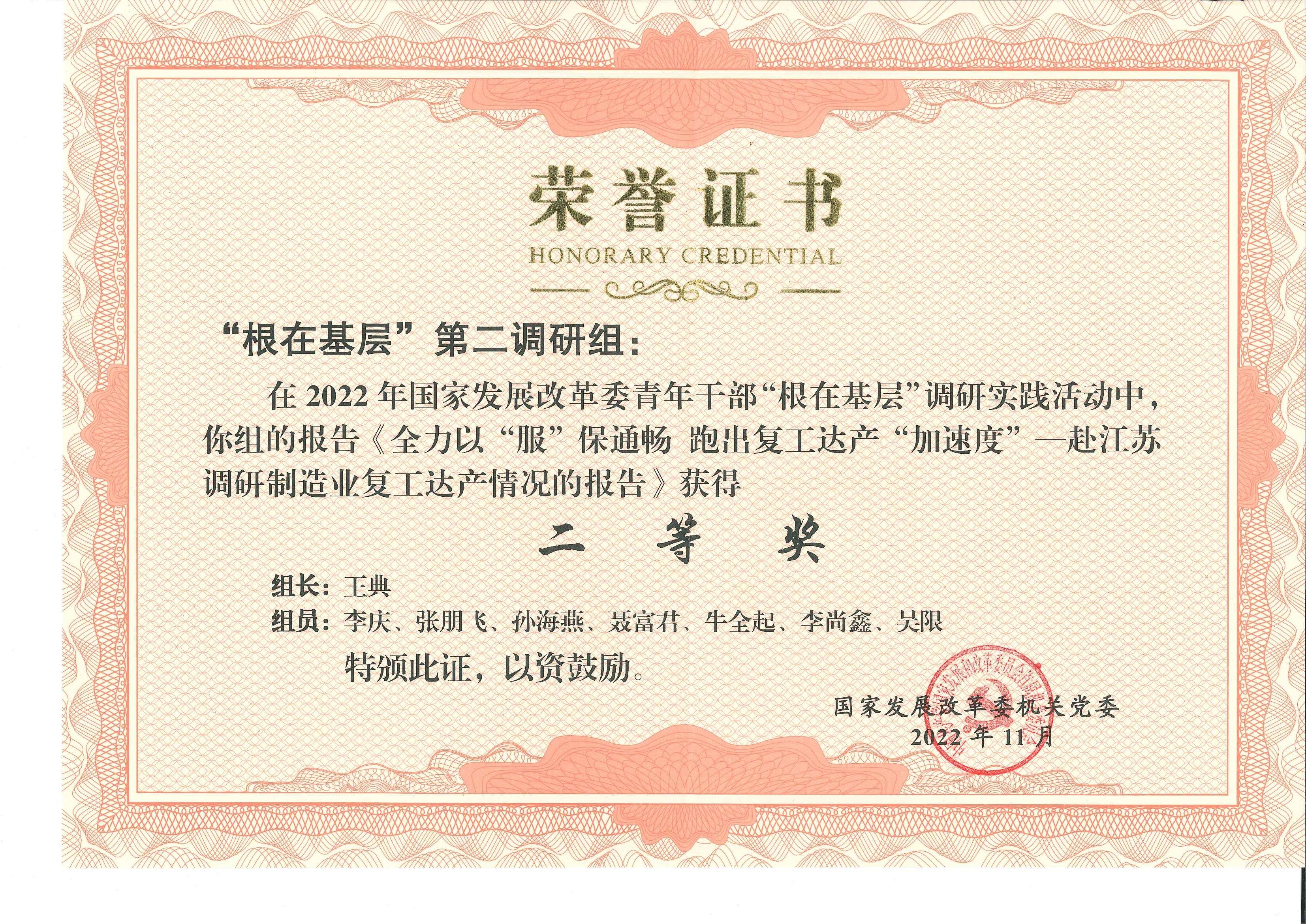 2022年国家发展改革委青年干部“根在基层”调研实践活动调研报告获奖名单已于近日揭晓,我局熊丹同志参与的调研报告《财力保障薄弱 执行落实缺失 基层“三保”如何兜牢?——贵州基层“三保”当前面临的主要问题与政策建议》荣获一等奖,孙海燕同志参与的调研报告《全力以“服”保畅通 跑出复工达产“加速度”——赴江苏调研制造业复工达产情况的报告》荣获二等奖。