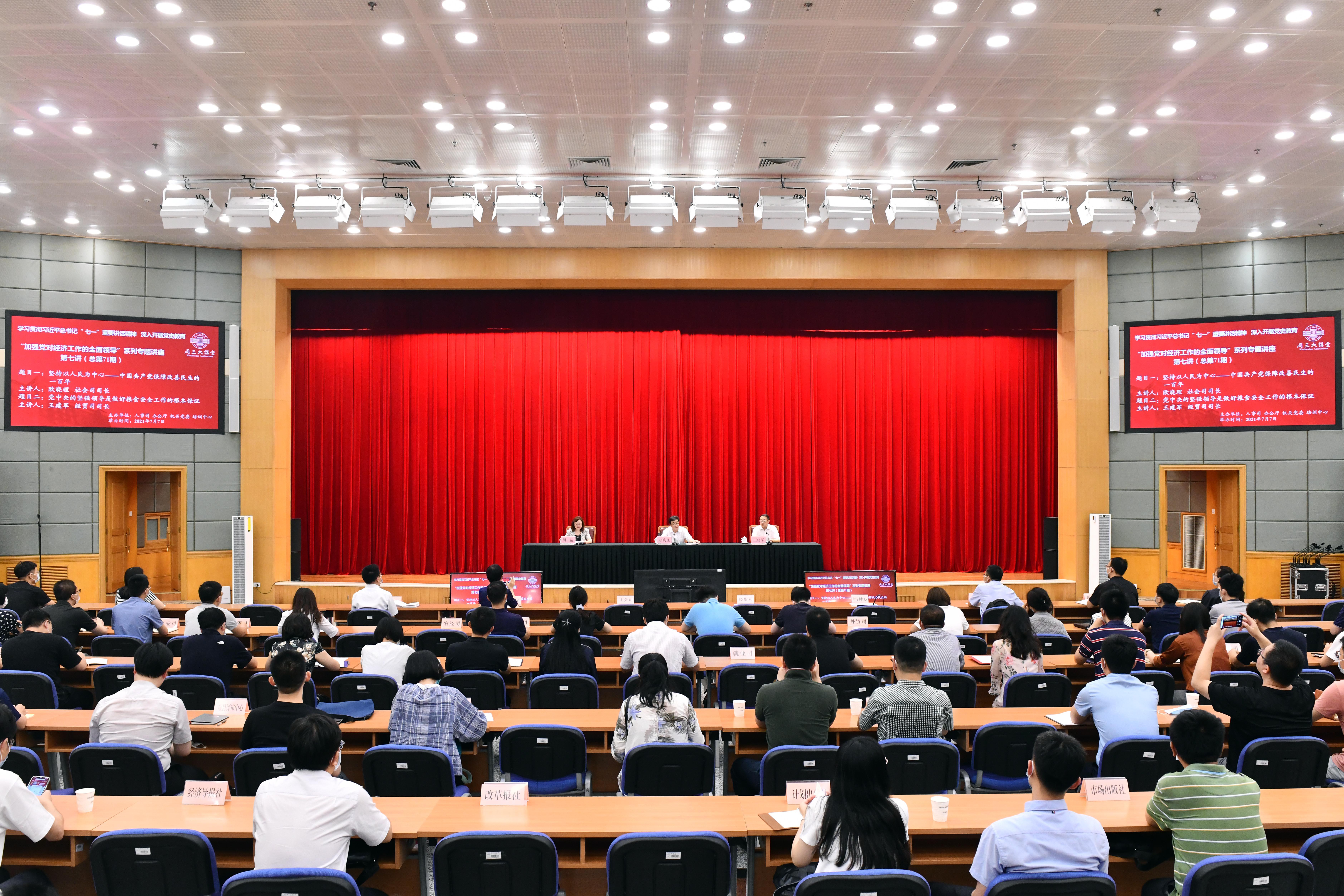 按照委党组部署,7月7日上午,我委举办“加强党对经济工作的全面领导—贯彻落实党的十九届五中全会精神 深入开展党史学习教育”周三大讲堂系列专题讲座第七讲,请社会司司长欧晓理同志以“坚持以人民为中心—中国共产党保障改善民生的一百年”为题、经贸司司长王建军同志以“党中央坚强领导是做好粮食安全工作的根本保证”为题,分别作报告。讲座由培训中心副主任周清同志主持,机关各司局、各直属单位干部代表230多人现场参会。