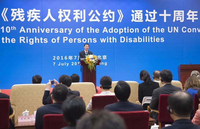为纪念《残疾人权利公约》通过十周年,2016年7月7日国务院残疾人工作委员会在京举行纪念联合国《残疾人权利公约》通过十周年大会。国务委员、国务院残疾人工作委员会主任王勇出席活动并讲话。王勇指出,联合国《残疾人权利公约》是第一部全面保障残疾人权利的公约,中国政府是公约的倡导者、践行者,“十二五”时期,中国有588万农村贫困残疾人脱贫,1000多万残疾人享受最低生活保障,近100多万农村特困残疾人得到政府救助供养,1000多万残疾人得到康复服务,中国城镇就业残疾人总数达430多万,有1600多万农村残疾人从事力所能及的农业生产和多种形式的就业。此外,中国的残疾人保护法规体系日益完善,中国残疾人的基本人权和自由受到宪法和70多部法律的保障,并形成了以《残疾人保障法》为核心的法律保障体系。