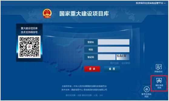 访问重大库互联网网站(http://kpp.ndrc.gov.cn),在页面右下角点击“模拟演练系统”,即可使用 “国家重大建设项目库模拟演练”服务。