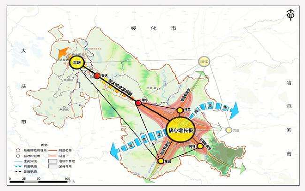 组织编制《哈尔滨大庆绥化一体化发展规划》,明确“龙江引擎、振兴先锋、创新策源、开放枢纽、绿色典范”战略定位,推动形成“一核引领、两带支撑、三城互动、全域协同”空间格局。发挥哈尔滨省会龙头作用和哈尔滨新区、自贸试验区平台载体优势,打造1小时经济圈。依托哈大、哈绥综合交通廊道,引导资源要素向沿线平台集聚,打造哈大创新发展带、哈绥绿色发展带。建设哈大科创走廊,在高新技术产业发展、传统产业升级、新兴产业培育等方面发挥支撑作用,着力促进科技成果转化。突出绿色有机、寒地黑土、非转基因特色优势,打造全国最大绿色农产品生产加工基地,推动一二三产融合发展。