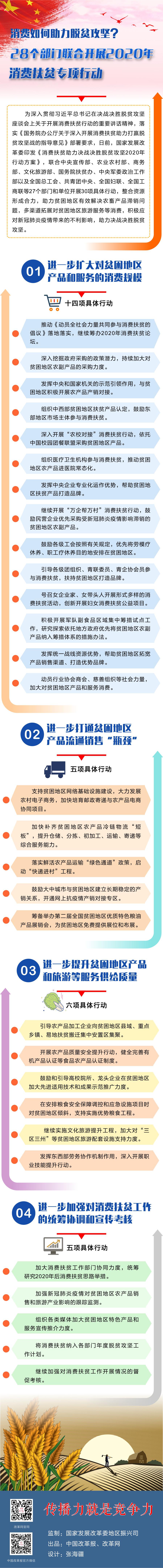 为深入贯彻习近平总书记在决战决胜脱贫攻坚座谈会上关于“开展消费扶贫行动”的重要讲话精神,落实《国务院办公厅关于深入开展消费扶贫助力打赢脱贫攻坚战的指导意见》部署要求,日前,国家发展改革委印发《消费扶贫助力决战决胜脱贫攻坚2020年行动方案》(以下简称《行动方案》),联合中央宣传部、农业农村部、商务部、文化旅游部、国务院扶贫办、中央军委政治工作部以及全国总工会、共青团中央、全国妇联、全国工商联等27个部门和单位开展30项具体行动,持续释放消费扶贫政策红利,助力决战决胜脱贫攻坚。