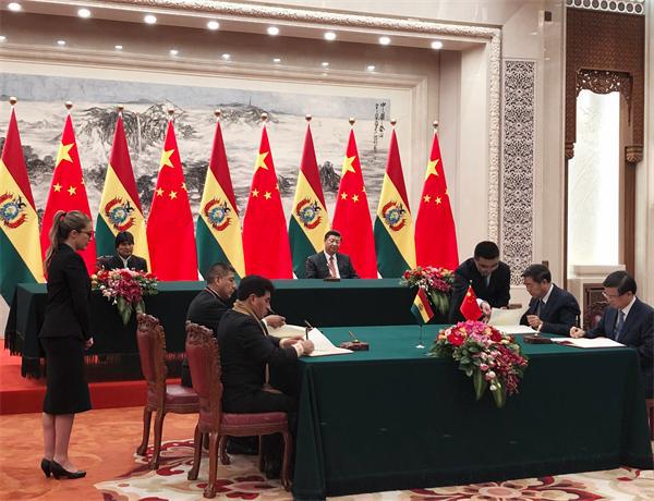 6月19日,在习近平主席和玻利维亚莫拉莱斯总统见证下,国家发展改革委主任何立峰与玻外交部长瓦纳库尼签署《中华人民共和国政府与多民族玻利维亚国政府关于共同推进丝绸之路经济带和21世纪海上丝绸之路建设的谅解备忘录》。中玻双方将在共建“一带一路”框架下,以“共商、共建、共享”为原则,加强政策沟通、设施联通、贸易畅通、资金融通、民心相通,为两国实现共同发展与共同繁荣,推动构建人类命运共同体作出贡献。