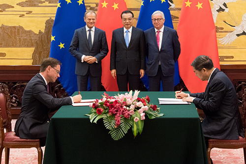 2018年7月16日,在李克强总理和欧洲理事会主席图斯克、欧盟委员会主席容克的见证下,何立峰主任与欧盟委员会副主席卡泰宁共同签署了关于循环经济合作的谅解备忘录。