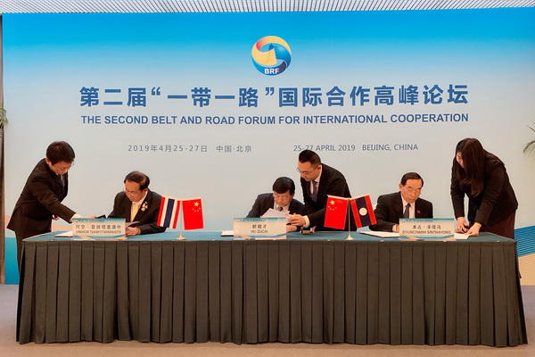 4月25日,在第二届“一带一路”国际合作高峰论坛设施联通分论坛上,国家发展改革委胡祖才副主任与老挝公共工程与运输部部长本占、泰国交通部部长阿空签署三国政府间关于万象-廊开铁路连接线的合作备忘录。