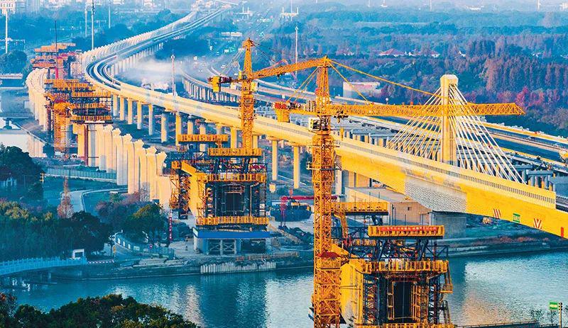 我国是唯一拥有联合国产业分类中全部工业门类的国家,制造业增加值连续14年稳居世界第一。图为2024年12月2日,位于上海市青浦区金泽镇的示范区线跨拦路港大桥建设有序推进,这是目前国内市域铁路最大跨度无砟轨道连续混合梁桥。中新社发 钟鑫旺/摄