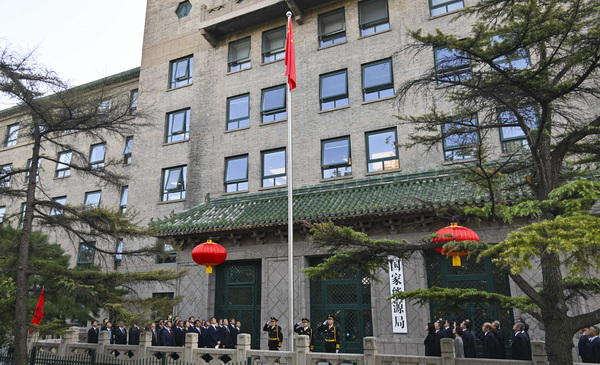 上午8时45分,升旗仪式正式开始。仪仗人员护送国旗至升旗台前,全体人员肃立行注目礼,五星红旗伴随着激昂的国歌声徐徐展开,在阳光下高高飘扬,熠熠生辉。