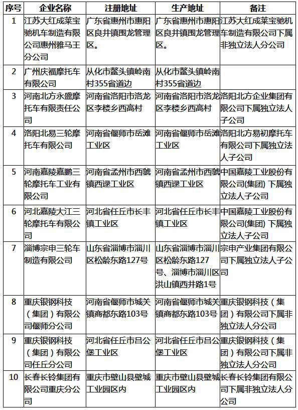 国家发展改革委《车辆生产企业及产品公告》拟发布的新增摩托车企业名单