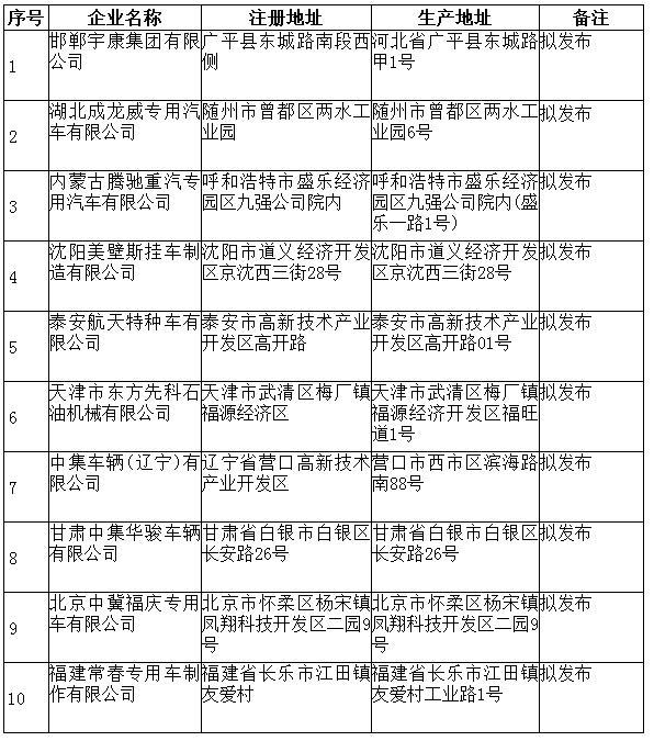 根据行政许可事项和原国家经贸委《关于车辆生产企业及产品目录管理改革有关问题的通知》(国经贸产业[2001]471号)的有关要求,现将《公告》拟发布的新增汽车生产企业予以公示,请社会各界监督,如有异议,请与我们联系。公示企业名单如下: