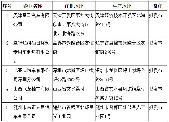 国家发展改革委《车辆生产企业及产品公告》(第156批)拟发布的新增汽车生产企业名单