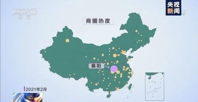 旅游景点人气旺,各地商圈也热闹非凡。国家信息中心选取了84个城市的重点商圈,通过大数据分析显示,今年上半年商圈的“人气”同比大幅增长86%,并超过了2019年的两成水平。特别是2月份,春节消费的热情,让商圈热度攀上顶峰。在这张图当中,圆圈大小代表同比增长多少,圆圈越大,就意味着增幅越大。其中涨势最旺的,是三线城市湖北襄阳,涨幅超过20倍。