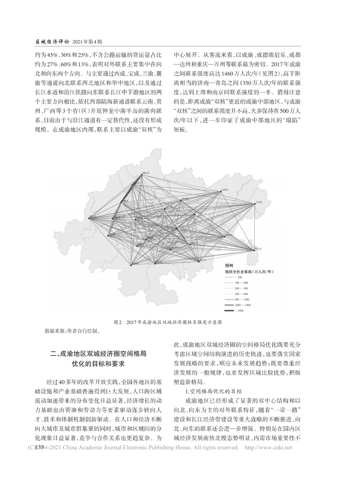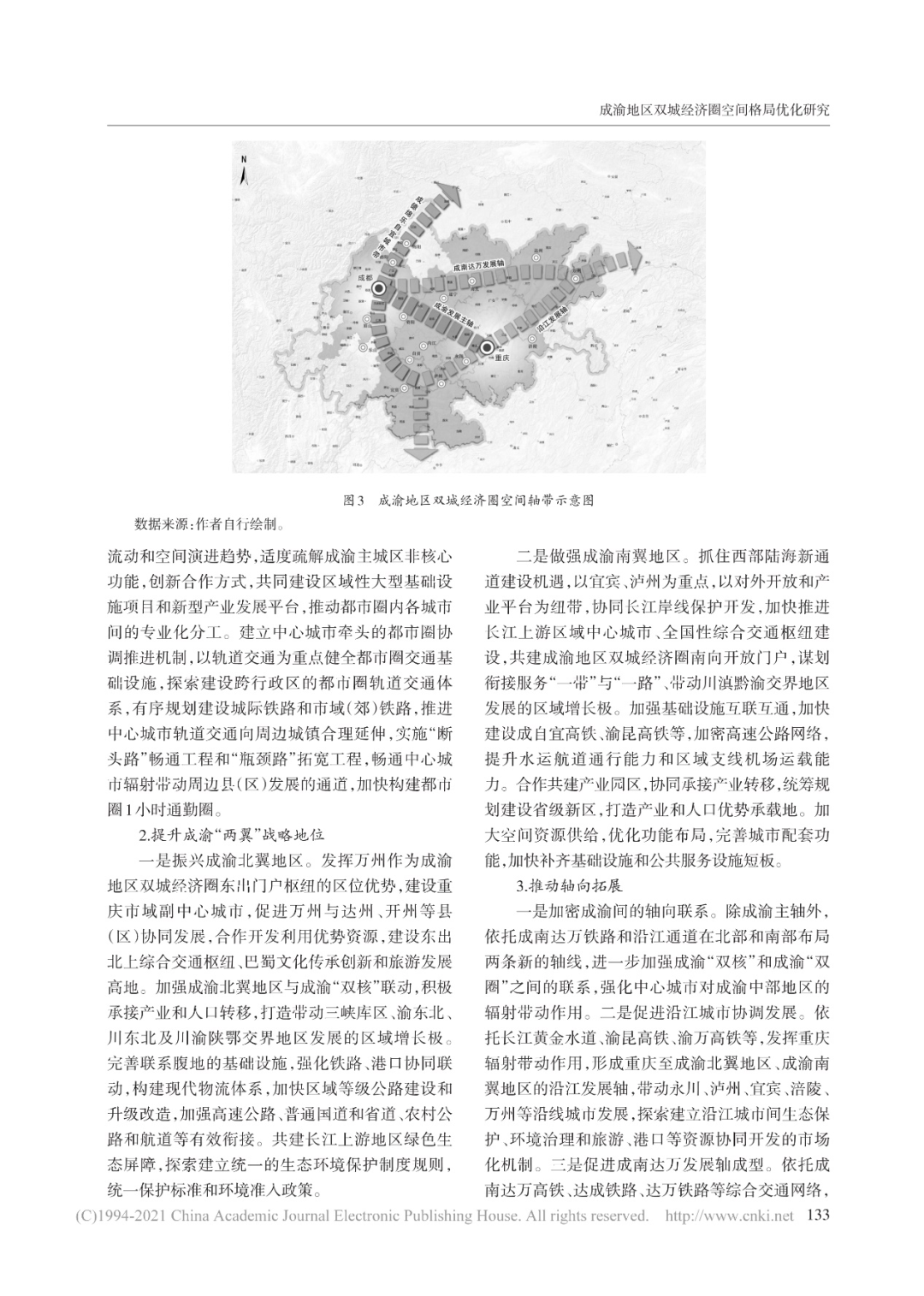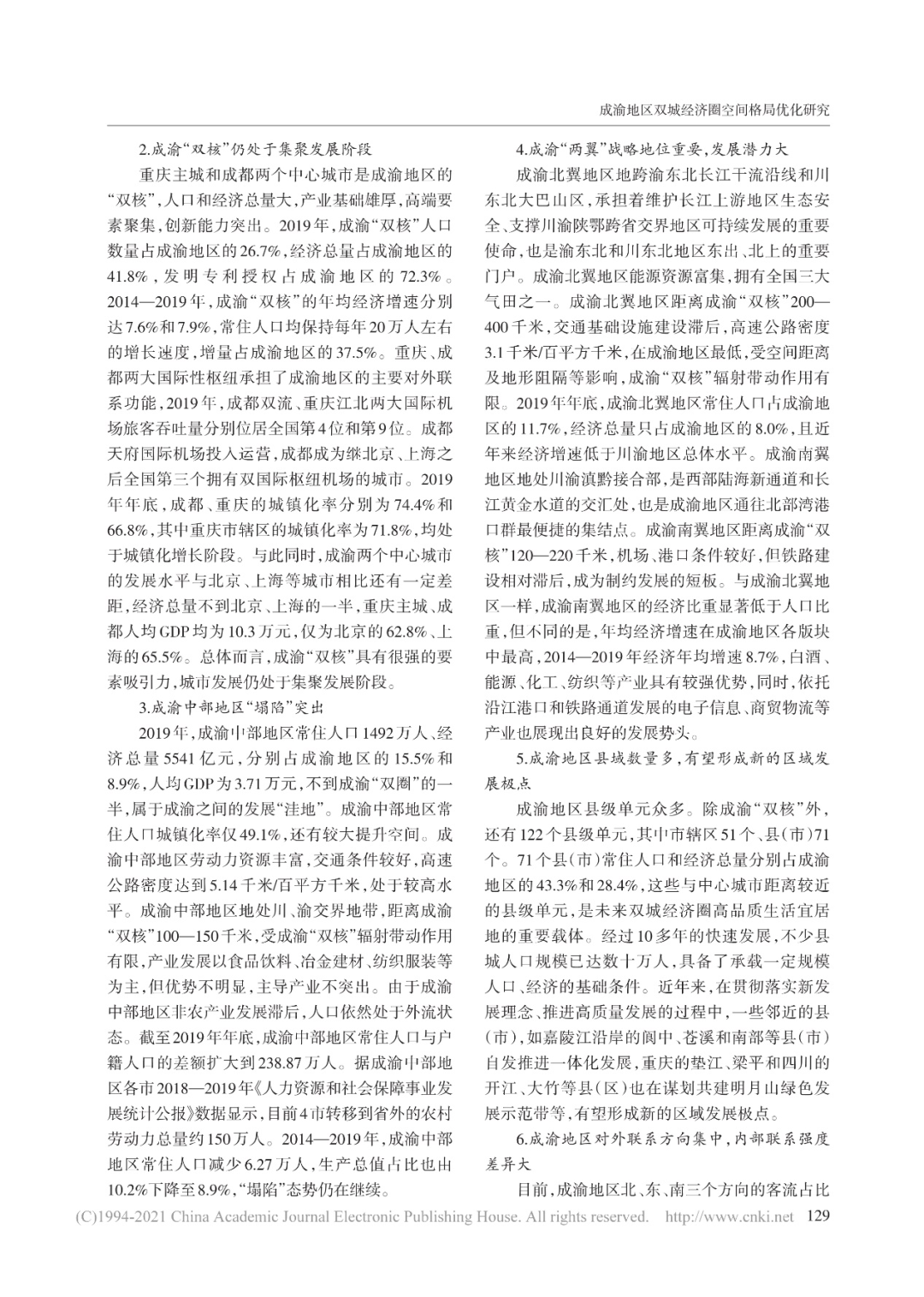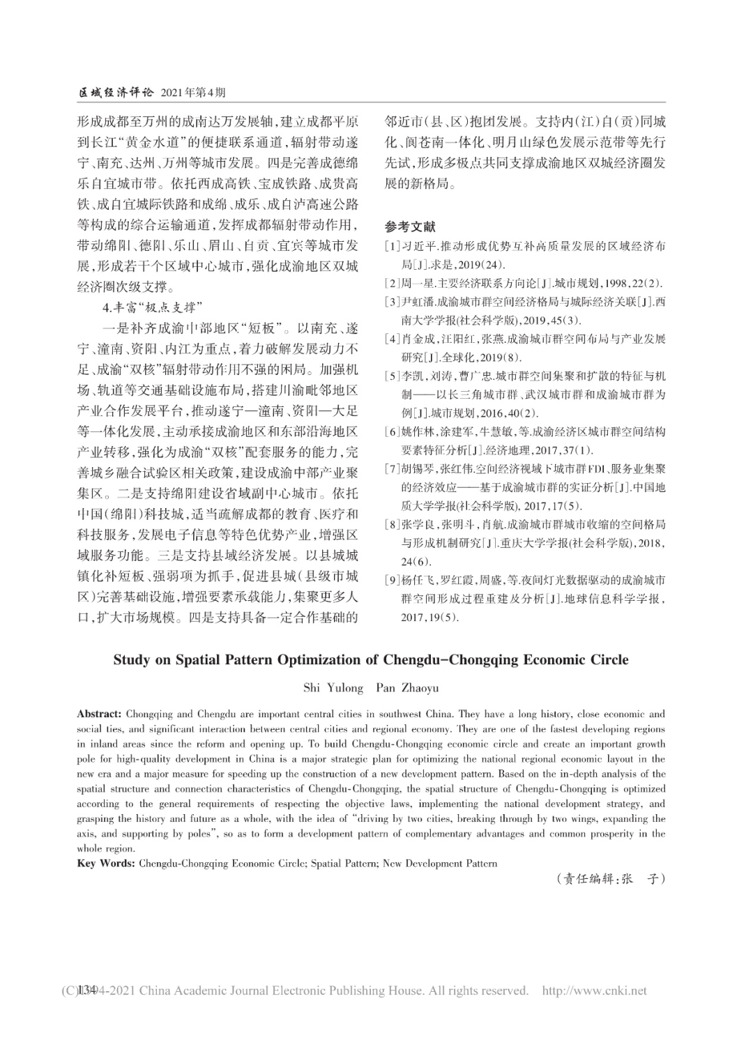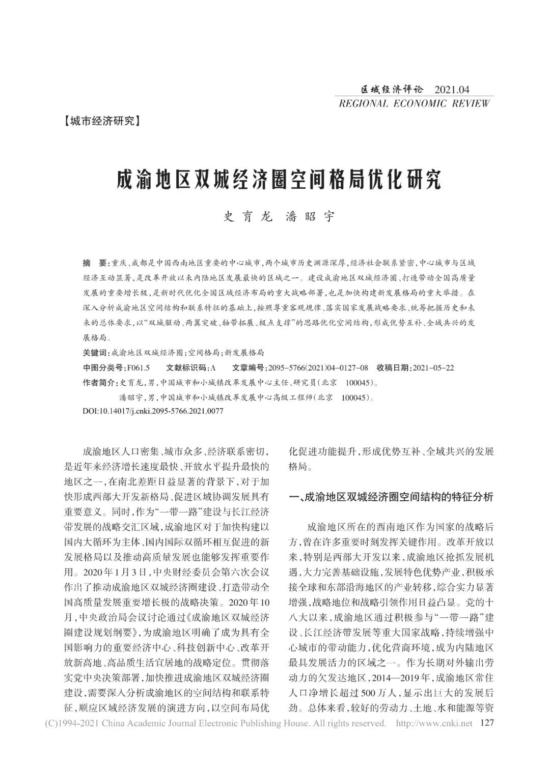 2021年7月,中国城市和小城镇改革发展中心主任史育龙、高级工程师潘昭宇在《区域经济评论》上发表《成渝地区双城经济圈空间格局优化研究》一文。文章指出,重庆、成都是中国西南地区重要的中心城市,两个城市历史渊源深厚,经济社会联系紧密,中心城市与区域经济互动显著,是改革开放以来内陆地区发展最快的区域之一。建设成渝地区双城经济圈、打造带动全国高质量发展的重要增长极,是新时代优化全国区域经济布局的重大战略部署,也是加快构建新发展格局的重大举措。在深入分析成渝地区空间结构和联系特征的基础上,按照尊重客观规律、落实国家发展战略要求、统筹把握历史和未来的总体要求,以“双城驱动、两翼突破、轴带拓展、极点支撑”的思路优化空间结构,形成优势互补、全域共兴的发展格局。