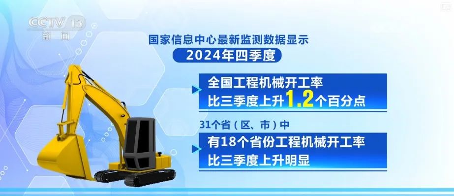国家信息中心最新监测数据显示,2024年四季度,全国工程机械开工率比三季度上升1.2个百分点,31个省(区、市)中,有18个省份工程机械开工率比三季度上升明显。