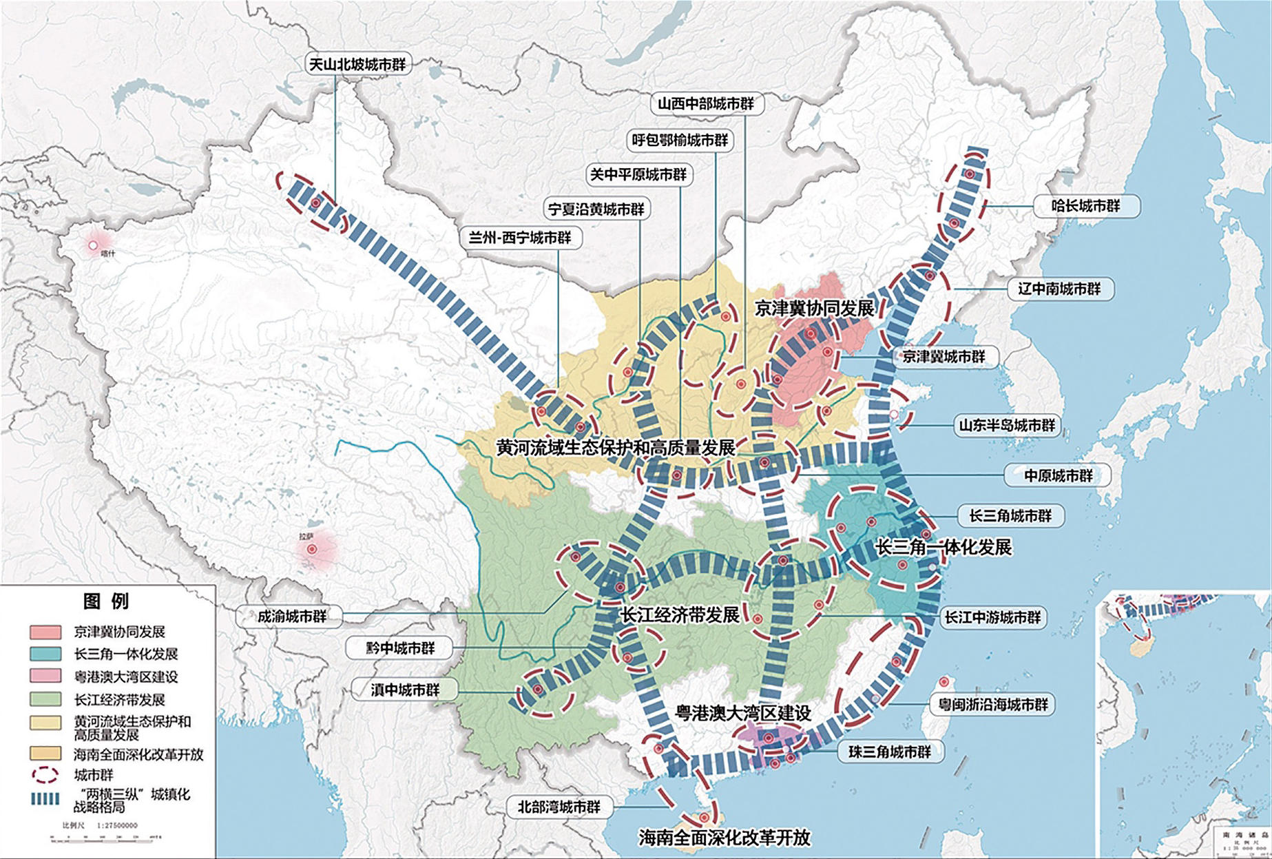 首先,“两横三纵”蓝色丝带交织,构成了国土开发的战略骨架。这一战略格局,以主要交通干线为轴,串起一个个城市群,形成人口和产业的核心集聚带。