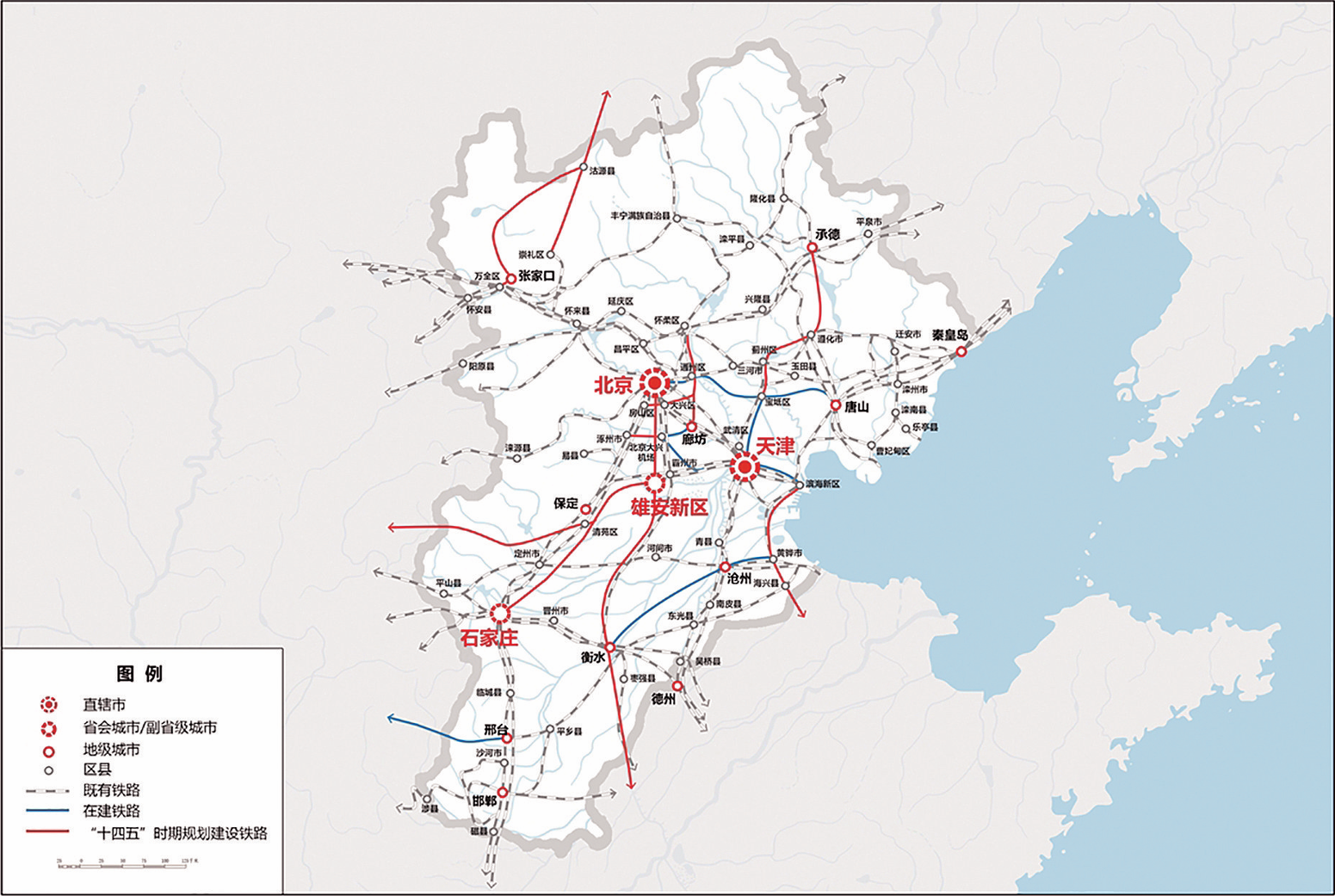 《京津冀地区轨道交通规划图》中红线的部分,代表了“十四五”时期规划建设线路。2022年,京港(台)高铁雄商段、京昆通道雄忻高铁相继开工,填补了京津冀区域西南、东南方向的铁路空白。其中,京港(台)高铁雄商段,是国家“八纵八横”高铁网的重要组成部分,是一条国家级高铁大动脉,计划2026年9月建成通车。雄忻高铁连接雄安新区与忻州市,计划将于2027年建成,建成后将加强京津冀城市群和晋中城市群的融合交流,成为连接我国西北、西南、华北和东北的大通道。2024年12月,石雄城际铁路开工建设。该段铁路是京津冀城际铁路网的客运主轴之一,建成后将形成环绕核心城市的“城际走廊”。