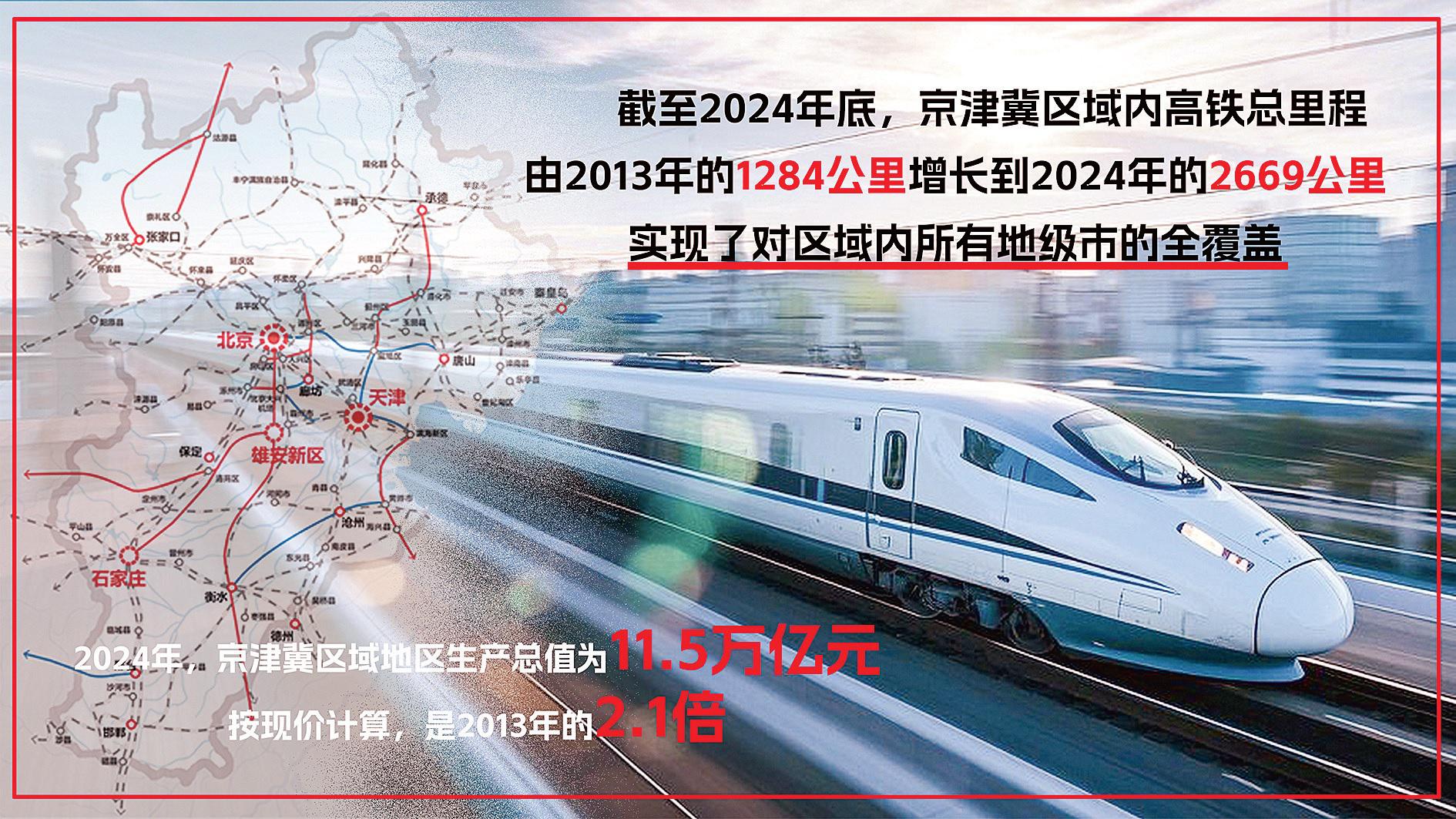 “轨道上的京津冀”,已从宏伟蓝图变为触手可及的日常。“截至2024年底,京津冀区域内高铁总里程由2013年的1284公里增长到2024年的2669公里,实现了对区域内所有地级市的全覆盖;京津冀铁路营业里程超1.1万公里,‘轨道上的京津冀’主骨架基本成形,京津冀地区‘1小时交通圈’初具规模。”2025年3月,北京市交通委员会党组书记、主任李军会在接受相关媒体采访时介绍。