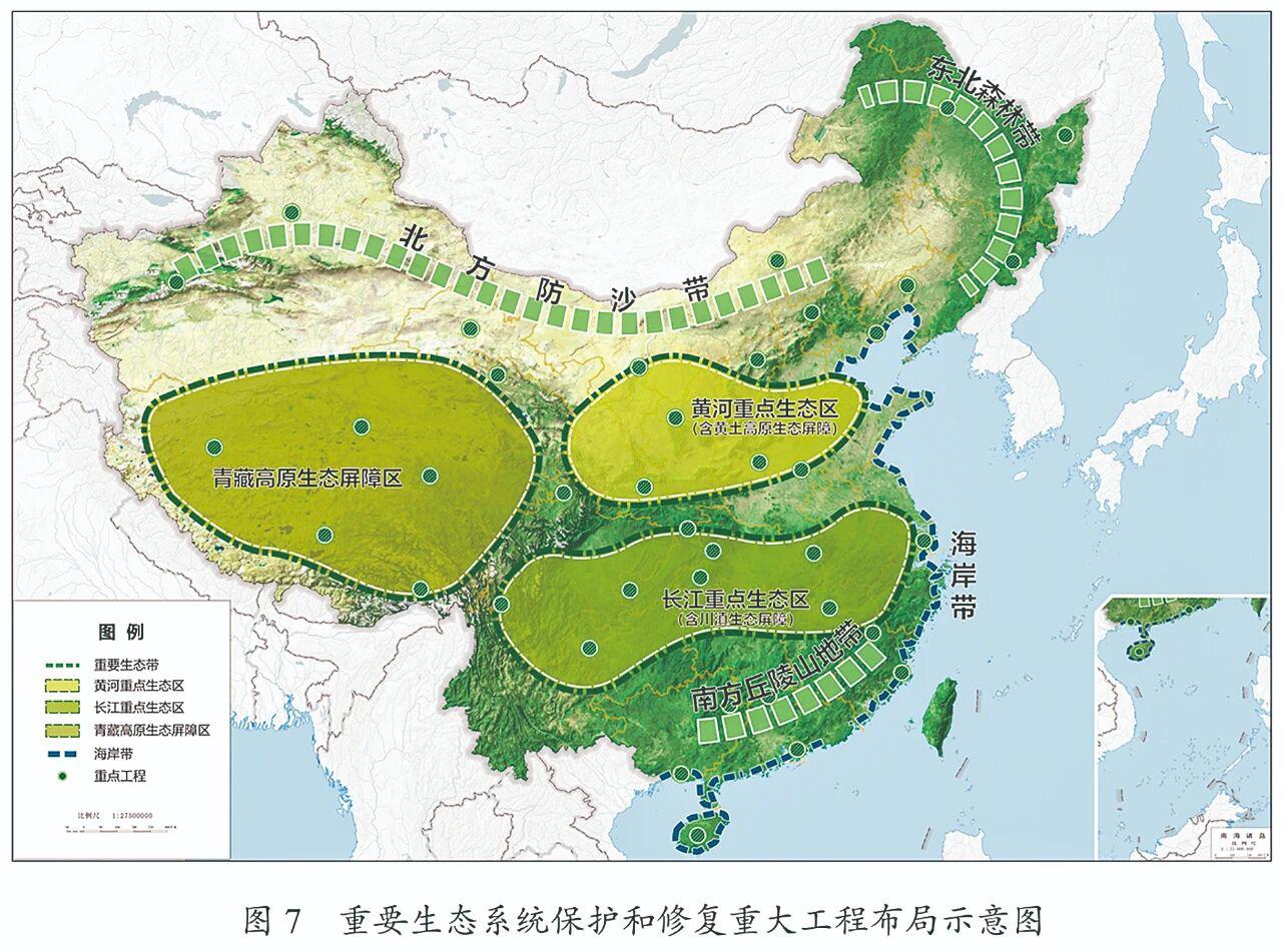《重要生态系统保护和修复重大工程布局示意图》是“十四五”规划中的七张图之一。在这张图上,清晰标注了青藏高原生态屏障区、黄河重点生态区(含黄土高原生态屏障)、长江重点生态区(含川滇生态屏障)、东北森林带、北方防沙带、南方丘陵山地带、海岸带等“三区四带”。这一布局涵盖我国主要生态安全骨架,是长江经济带发展、黄河流域生态保护和高质量发展等国家重大战略的生态支撑区域。