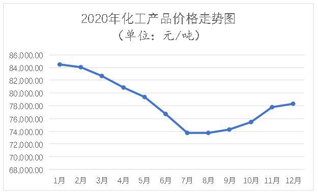 (二)化工产品。一二季度受疫情影响及国际油价的不断下跌,上半年化工产品价格不断走低。平均价格由1月份的84449.02元/吨下降至8月份的73712.11元/吨,达到了全年最低点。自三季度开始,化工品需求改善,国际原油需求回升,8月底化工产品价格出现反弹。加之海外疫情的持续蔓延,部分海外订单转移至中国,第四季度化工市场价格开始强势上涨。12月份化工产品价格涨至78366.95元/吨。