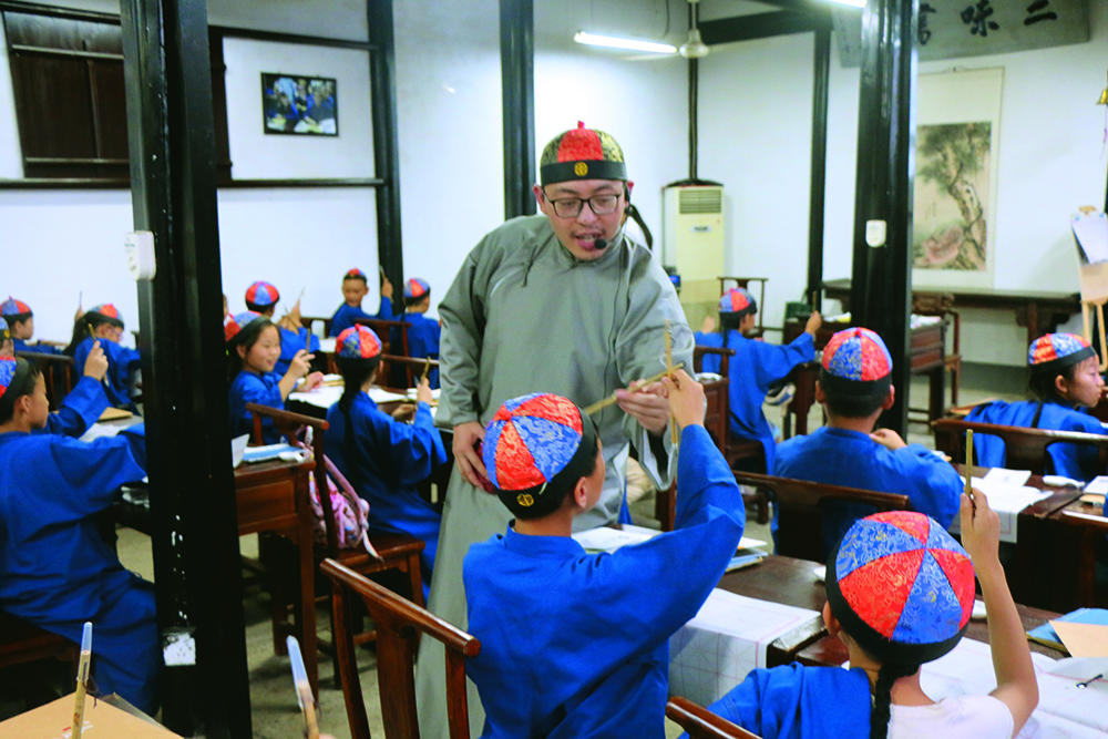 “三味书屋·鲁迅故里”研学游是鲁迅故里因地制宜开设的课程,当中包含“鲁迅作品展示课”“历史文化体验课”“三味早读情景课”。在鲁迅作品展示课中,学生可以到百草园,寻找文中提到的皂荚树、何首乌,也可以上公开课,表演课本剧,让原本枯燥的课堂在百草园里充满欢笑;历史文化体验课中,学生们能够在指导老师的带领下前往鲁迅笔下的风情园,感受绍兴非遗文化“水乡社戏”,了解鲁迅作品中关于“社戏”的描述,还能结合鲁迅小说《祝福》欣赏“绍俗祝福”,自己动手制作与鲁迅生活息息相关的乌篷船手工模型;而三味早读情景课的课堂上,学生们可以和私塾老先生一起读《三字经》、学对课、习大字、影描绣像、拓“早”字、做书签、猜风物,重温鲁迅儿时的求学场景。