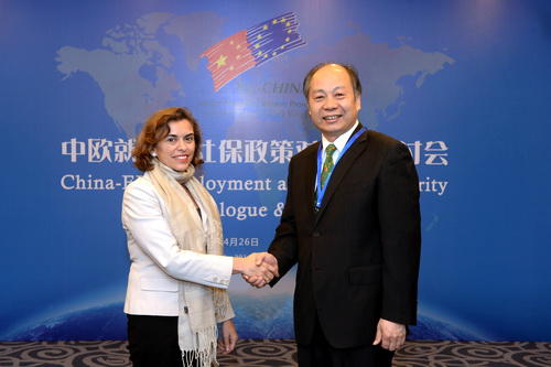 2016年4月26日,我委和欧盟驻华使团、欧盟委员会就业总司,就双方就业社保政策等进行了对话研讨。王晓涛副主任出席会议并致辞,就中国的就业社保形势和面临的压力,推进相关领域工作的考虑等发表了意见,提出了进一步加强双方合作的希望和建议。欧盟驻华使团临时代办卡门.卡诺女士就欧盟劳动力市场和各成员国社会保障政策等致辞。我委副秘书长范恒山出席会议并主持了对话。