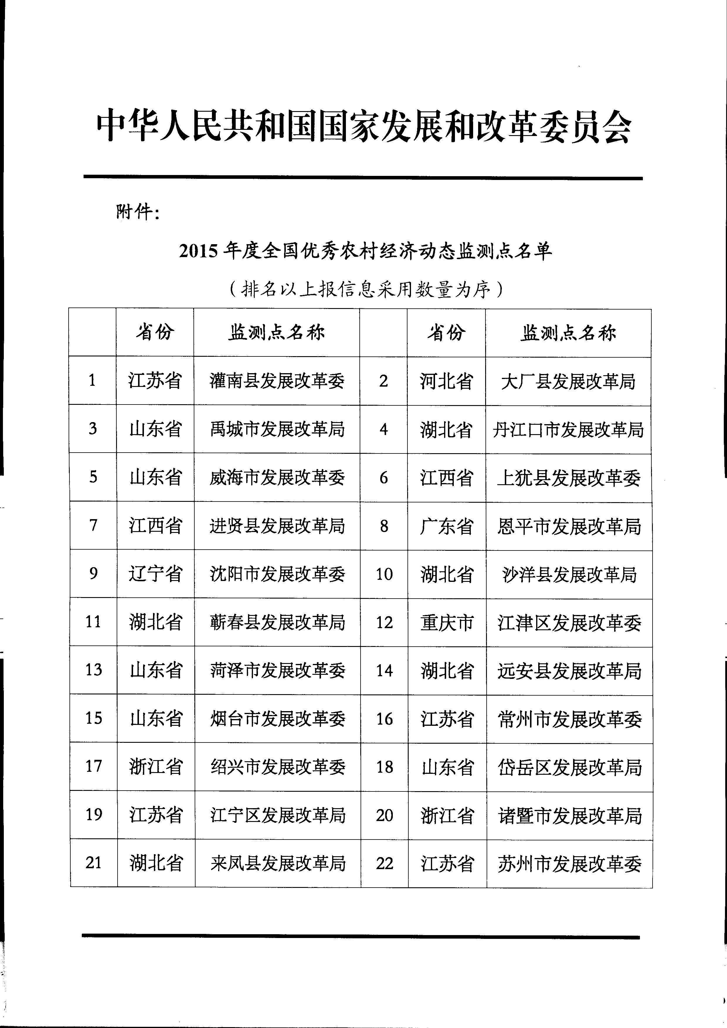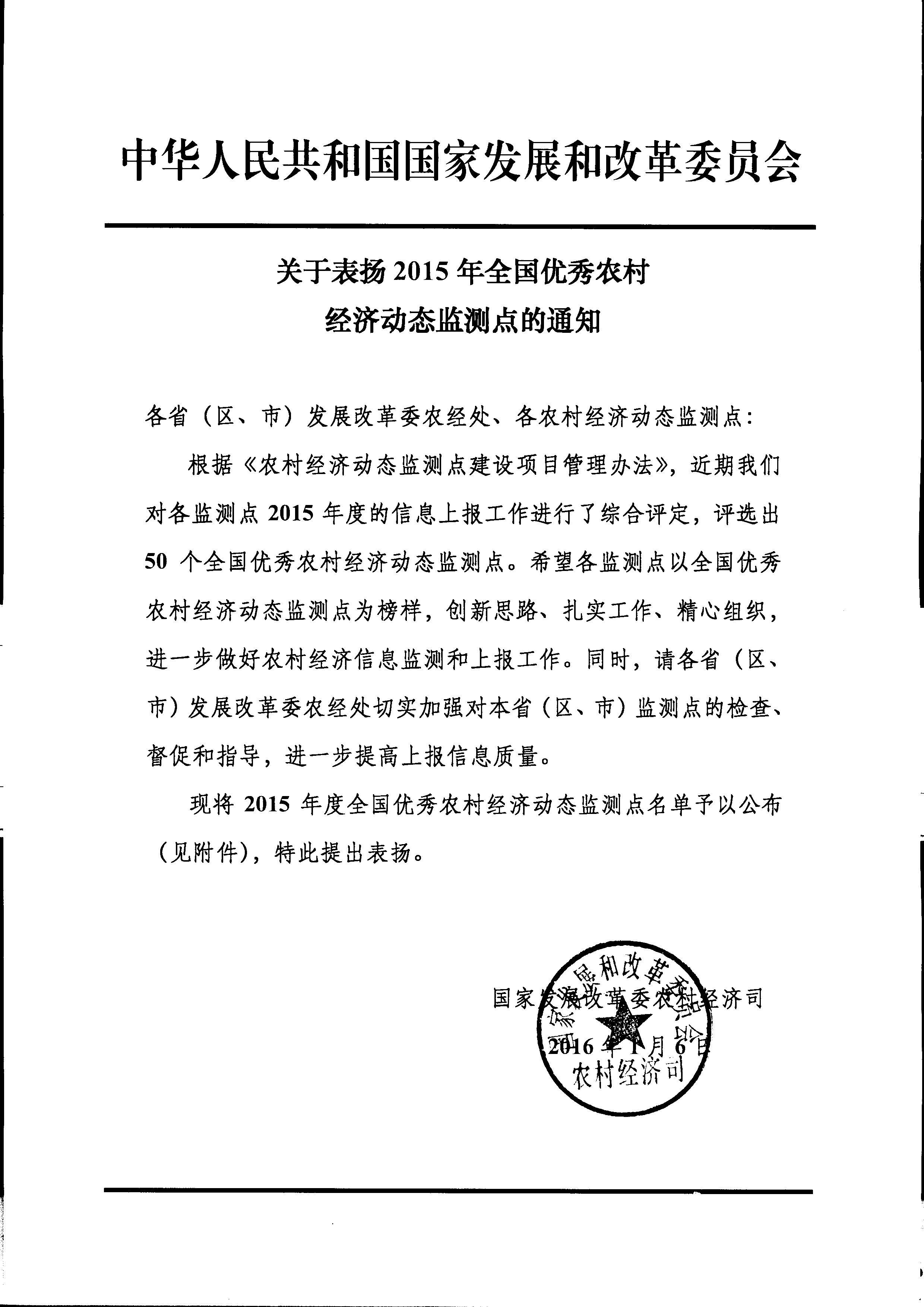 关于表扬2015年全国优秀农村经济动态监测点的通知