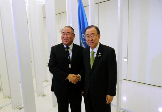 解振华介绍了近年来中国采取的应对气候变化行动和成果。解振华表示,中国是一个负责任的发展中国家,一直发挥着积极建设性作用。中国积极落实到2020年单位国内生产总值二氧化碳排放比2005年降低40-45%,非化石能源占一次能源比重达到15%,森林蓄积量增加13亿立方米的行动目标。目前中国已实现碳强度下降28%,在保持经济增长的同时减少二氧化碳排放23亿吨,非化石能源占比达到9.6%,到2015年将达到11.4%。森林蓄积量增加17亿立方米,超额完成目标。中国还在42个省市开展了低碳试点,目的是在不同发展水平的地方实现二氧化碳排放峰值。碳交易试点也有积极进展,深圳市已经开始上线交易,年内北京、上海、广州也将开始交易。中国的节能环保产业已经吸收3000万人就业。目前中国国内正在论证到2030年的行动目标。解振华同时向潘基文介绍了中方对目前谈判进程的看法和期待。