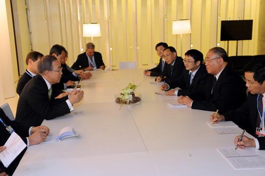 当地时间11月19日,出席联合国气候变化华沙会议中国代表团团长、国家发展改革委副主任解振华与联合国秘书长潘基文举行会谈。
