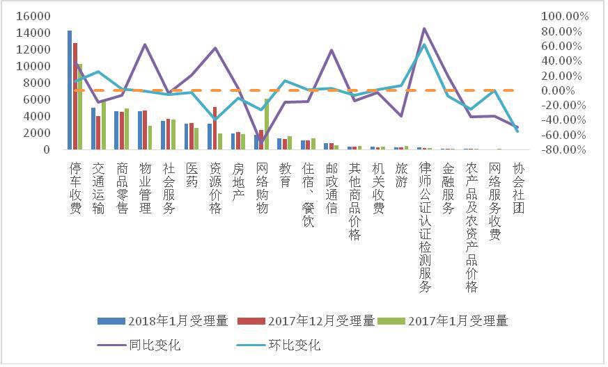 图3:2018年1月各行业受理量同比、环比变化情况