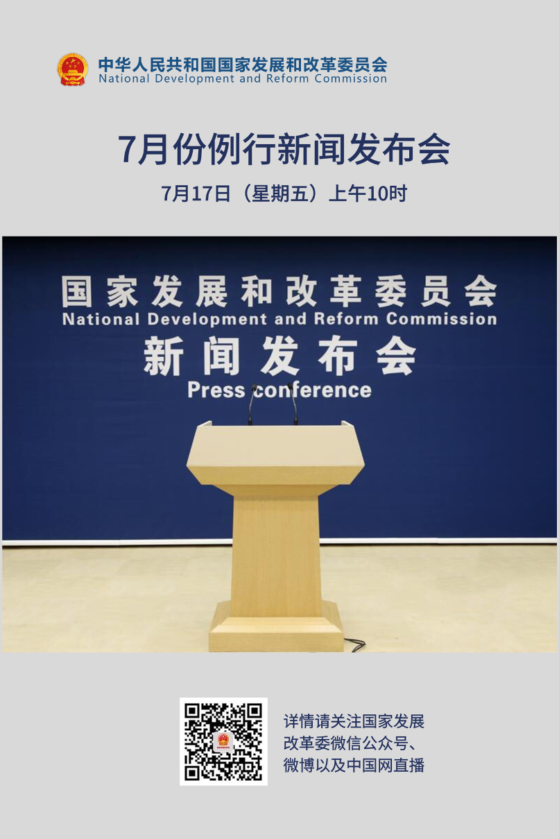 定于2020年7月17日(周五)上午10:00,召开7月份例行新闻发布会,我委新闻发言人和相关司局负责同志出席。本次发布会采取线上发布形式, 欢迎关注国家发展改革委微信公众号、微博以及中国网直播。