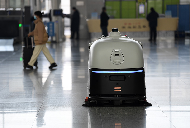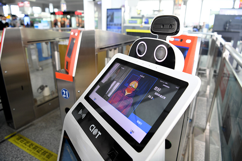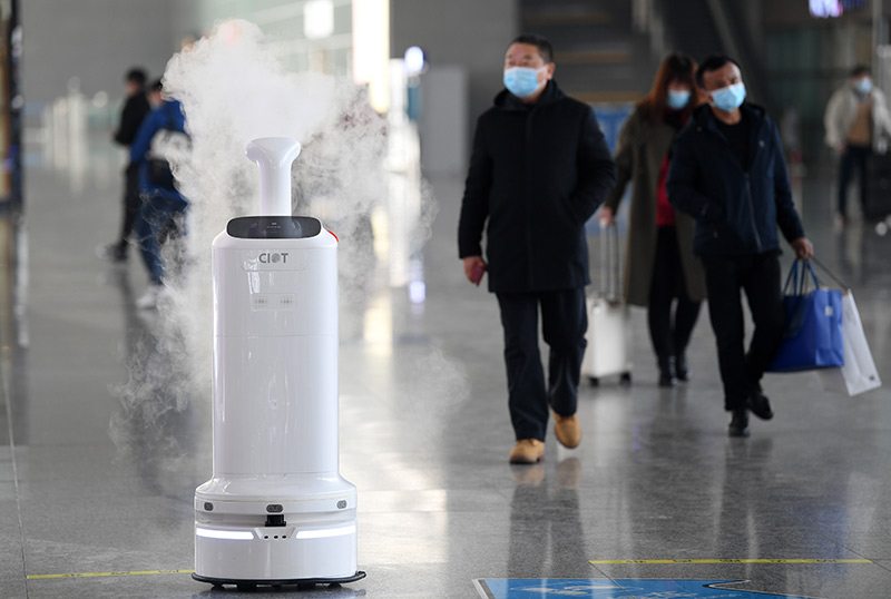 年春运期间,空气环境自动消毒机器人“小创”、智能防疫测温机器人“大白”、地面清扫消毒机器人“小德”组成防疫“天团”,在安徽合肥南站上岗,运用智能科技手段服务春运疫情防控。