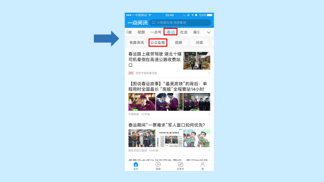 目前,用户在“一点资讯”上“春运”频道后,会发现频道下方的二级菜单中多了一个“公众监督”入口,点击即可直接跳转至“公众监督”APP页面。在此页面上,网民可以进行举报违法违规、投诉服务质量、举报不文明行为、自定义监督、点赞暖心服务、表扬好人好事等功能可选。
