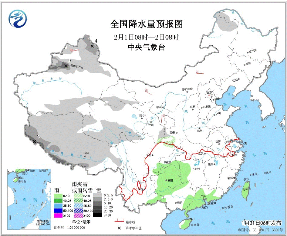 图1 全国降水量预报图(1月31日08时-2月1日08时)