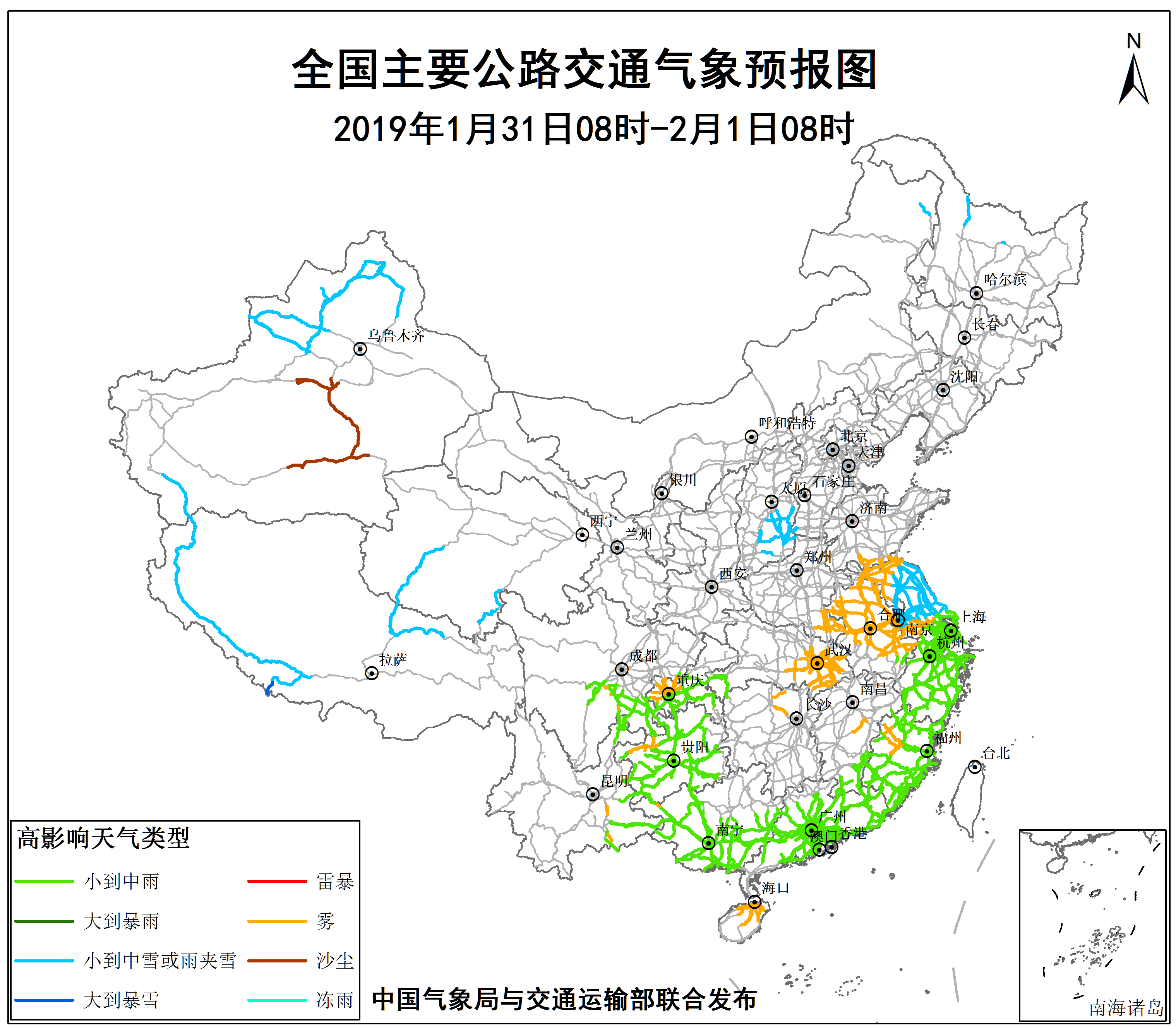 1月31日白天到夜间,新疆北部、西藏南部、青海西南部、山西中部、江苏、浙江、福建、广东、广西西部和南部、贵州、云南东部及四川盆地南部等地道路交通将受雨雪天气影响;新疆南疆盆地部分路段受扬沙或浮尘天气影响。31日夜间至2月1日上午,山东南部、安徽大部、江苏北部和西南部、河南东南部、湖北东部、湖南北部、江西中东部、福建西部、重庆西部、四川东部、云南东部、广西西北部、海南岛北部等地的部分路段受雾影响(见图3)。