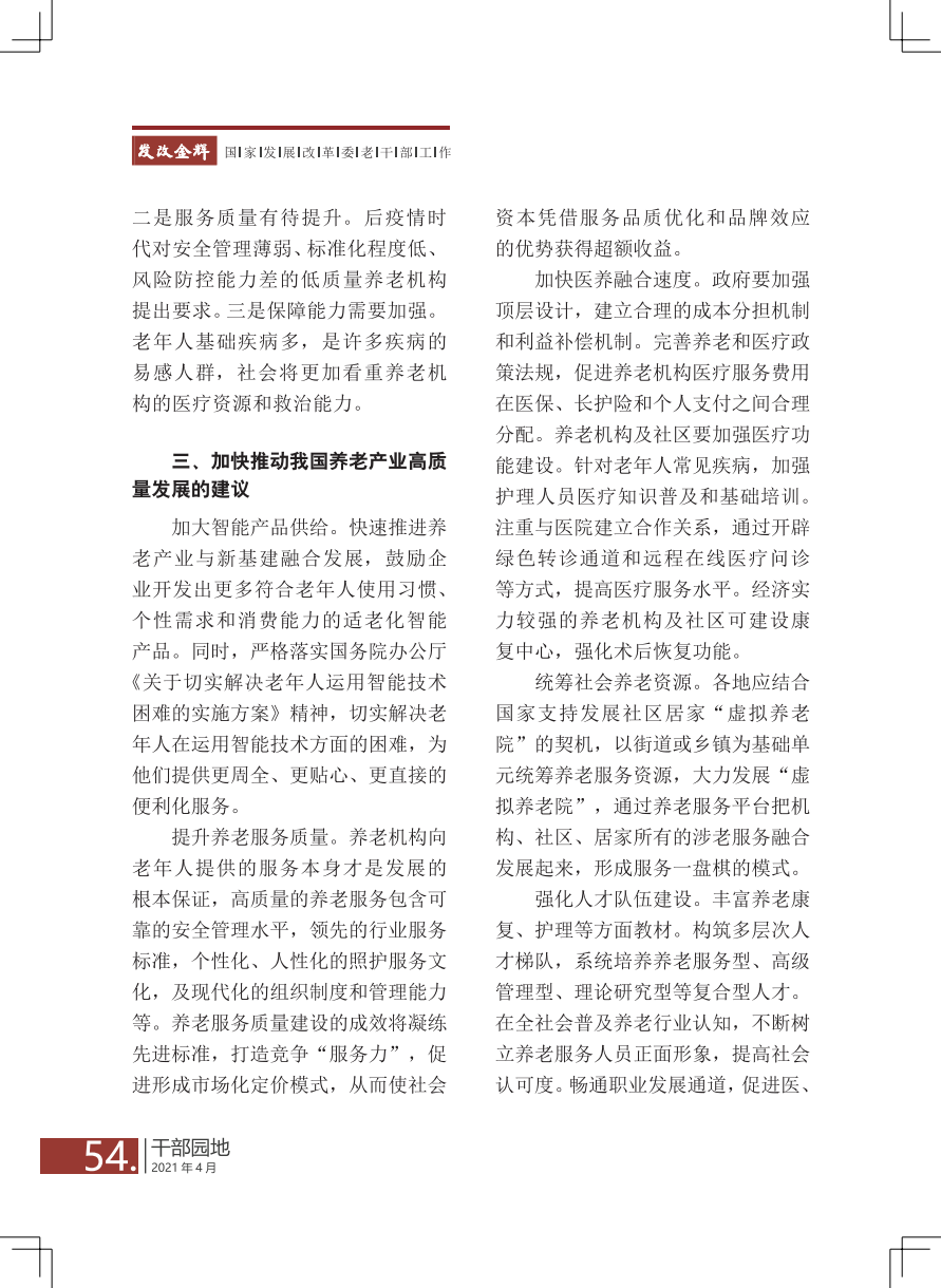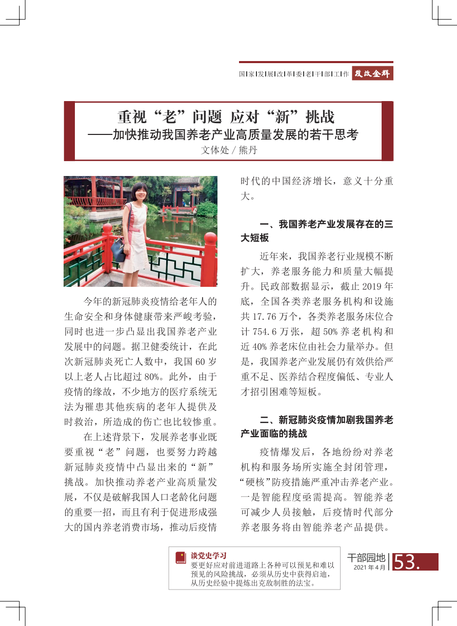 【心声交流·干部园地】重视“老”问题 应对“新”挑战——加快推动我国养老产业高质量发展的若干思考/熊丹