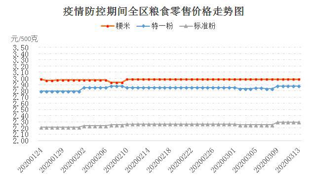 据全区监测情况,3月13日,面粉(特一)、面粉(标准)、粳米(标一)零售价格分别为2.88元/500克、2.30元/500克、2.99元/500克,与前一日相比,价格均持平。与节前相比(1月24日),面粉(特一)、面粉(标准)价格分别上涨2.86%、3.60%,粳米(标一)价格持平。