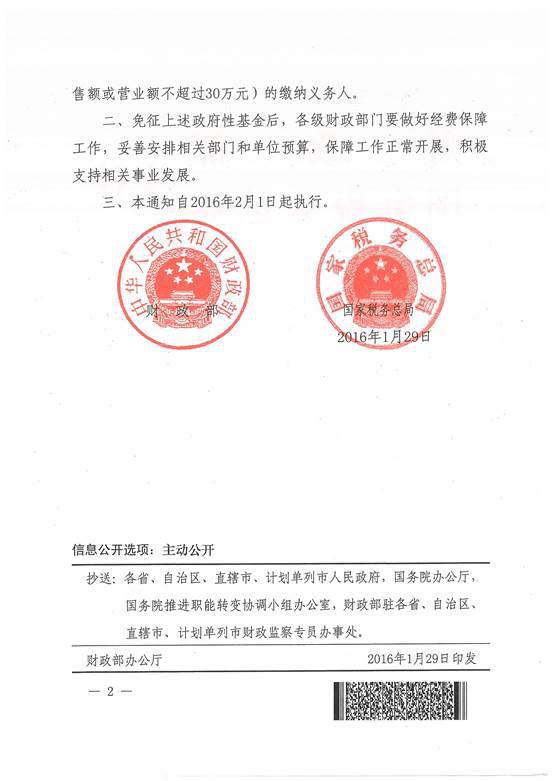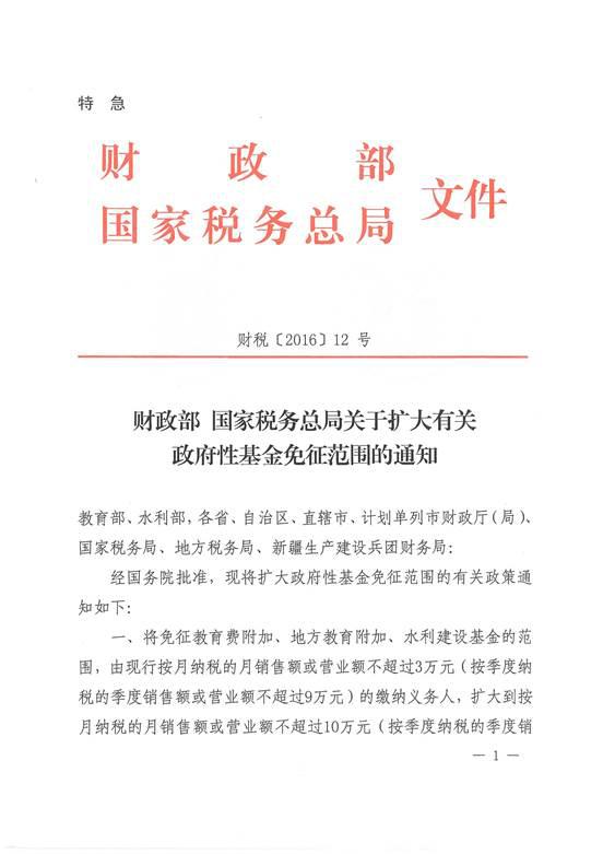 现将《财政部 国家税务总局关于扩大有关政府性基金免征范围的通知》(财税〔2016〕12号)转发你们,请遵照执行,并及时做好2016年2月1日起应予免征(指费款所属期为2016年2月1日起的相关政府性基金)但已征收的有关政府性基金退付工作。