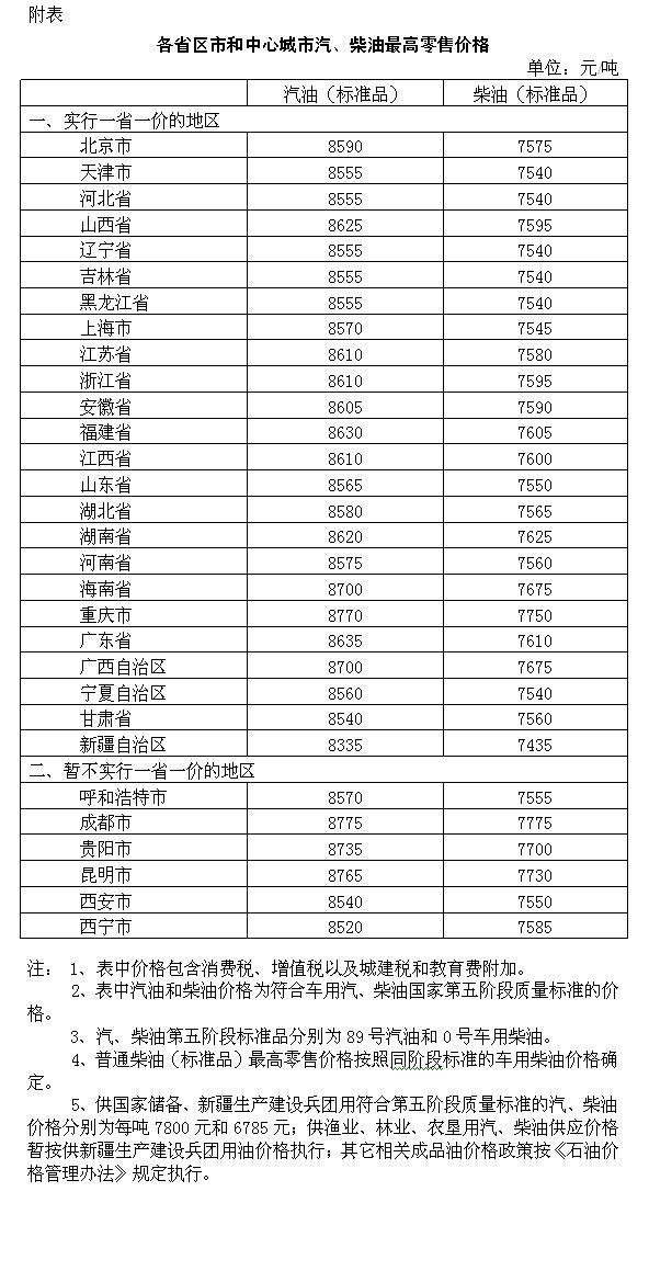 附:各省区市和中心城市汽、柴油最高零售价格